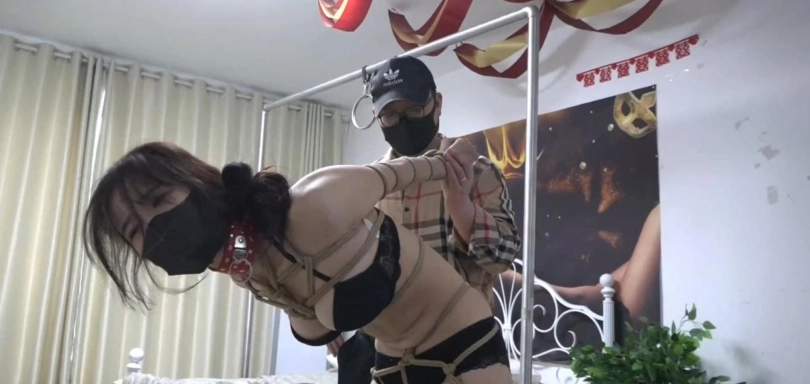 一眼望去凯文似乎跟正常人一样,身穿大衣双手插在了大衣两旁的兜兜里,只是脖子上的一个红色的项圈告诉了我们事情并没有那么简单。果然凯文被眼镜小哥带回家中,正不知所措的左顾右看的,眼镜小哥解开了凯文大衣上的衣扣,而大衣之下的凯文被绳索捆绑的结结实实,来回缠绕显得极具美感。突然凯文觉得自己被直臂捆绑起来的双手被人抬了起来,使她不得不低着自己的身体,不仅如此眼镜小哥还慢慢的推动着凯文向前走着,在客厅之中来回走着,似乎觉得凯走的有些慢,一旦凯文的速度慢下来,眼镜小哥就拍打着凯文的臀部让她继续向前走。走了好几圈之后,眼镜男子将凯文的双臂固定在了柱子上,让她跪坐下来,慢慢的欣赏着凯文挣扎的模样~