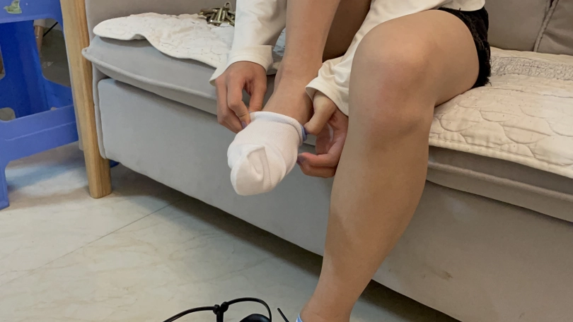 室内,罗菱菱穿着日常的裙子,穿着黑色凉鞋(镜头开始是全身,然后放大,从上往下拍穿着鞋的脚的特写,约两分分钟)。然后小茜拿着短牛仔裤和白色T恤,去房间换上短牛仔裤和T恤,脚上穿着黑色凉鞋出现在镜头面前。(镜头移动。相机倾斜60度这样,拍大腿到脚的下半身部分,就是大腿和脚要同框。再镜头放大,特写穿鞋的脚)。然后坐凳子上,慢慢脱下凉鞋,穿上船袜,穿上运动鞋,戴上手铐和脚镣,来回走动一下。然后坐在凳子下,慢慢脱下一只脚的运动鞋和船袜,穿上凉鞋。再脱下另一只脚的运动鞋和船袜,穿上另一只脚的凉鞋。把手铐打开,双手背在后面,走来走去,拿起手机,玩一下手机(镜头多拍一下模特穿着凉鞋的脚,多拍一下下半身部分)。