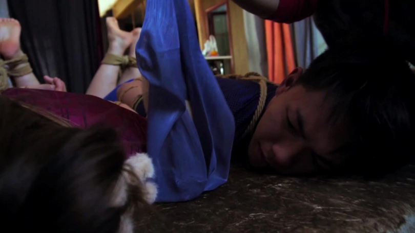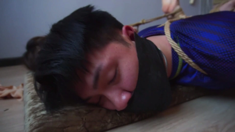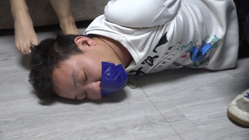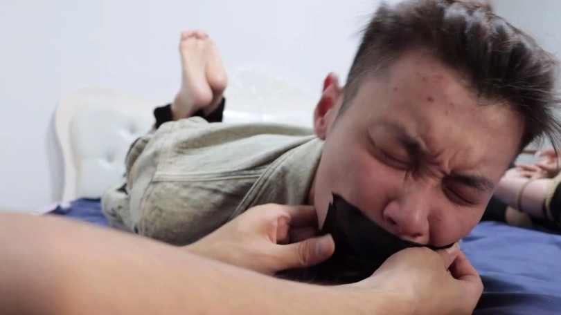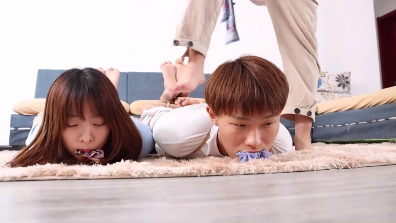 片段4:帅哥康行与女友小琛被歹人入室劫持后先用原味内裤塞嘴,二人互相解绳子被发现,歹人生气将他们捆成驷马并脱掉二人脚上穿的原味锦纶丝袜交换塞入情侣二人口中,并用胶布绷带一圈圈将他们嘴封严实。