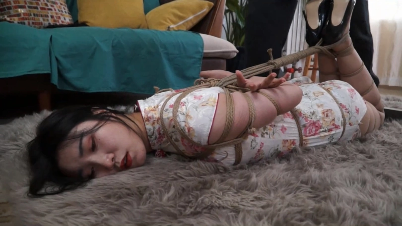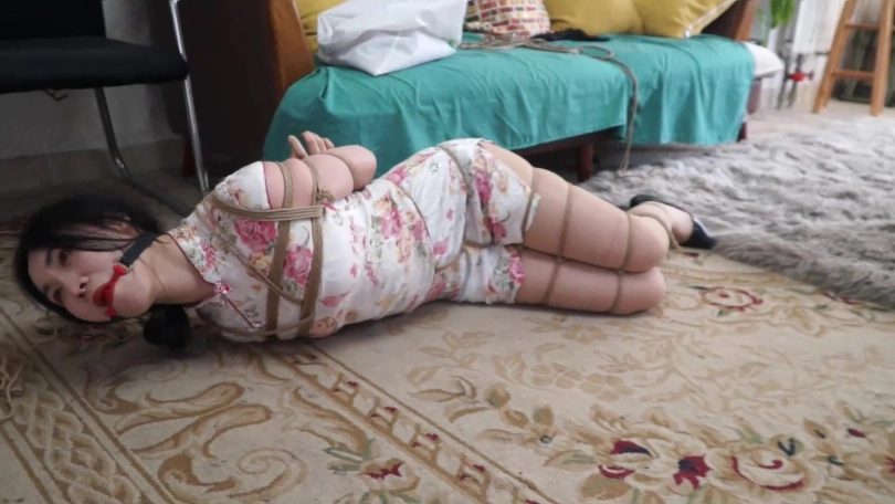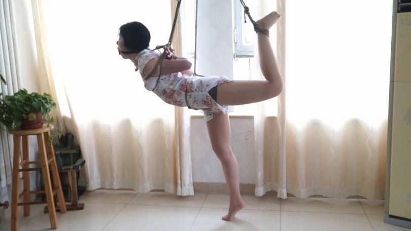 一共三段紧缚:第一段是后手观音跪坐团缚,模特身前有绳子拉着不能直起来,身后有绳子吊着也不能趴下去,就只能保持这么一个难受的弯腰姿势;第二段是单脚吊,下面绑了打结股绳并用绳子吊到了横梁上,模特为了缓解股绳的紧缚感只能努力踮起脚尖;第三段是日式后高手极限驷马,驷马绑好后还用绳子吊在横梁上,口球也用绳子牵拉着,模特基本上没有任何挣扎的空间。