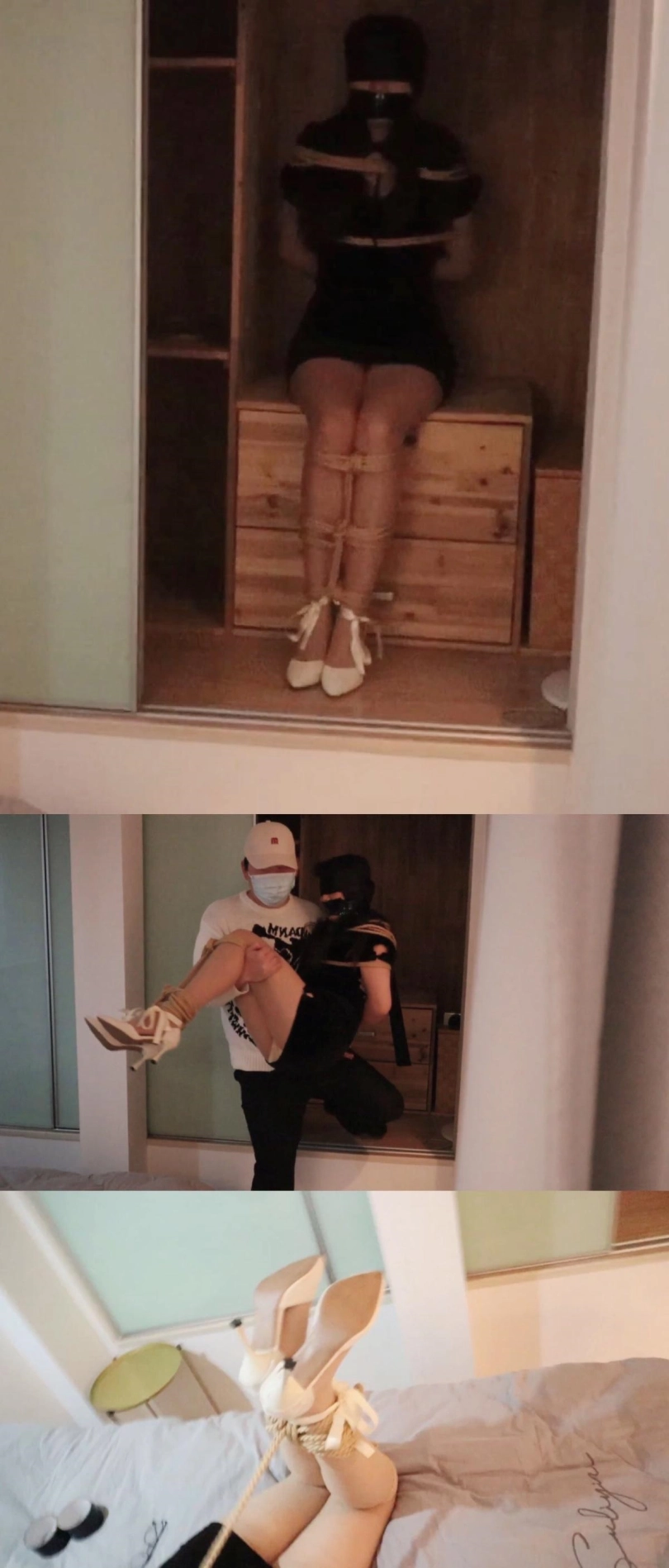 一上手触碰到旗袍少女的身体就开始敏感起来惊呼起来,但嘴巴被堵住讲不出来话,只有呜呜的叫声,静静看着黑旗袍少女无助挣扎喊救命的样子,把少女从壁橱抱到床边脱掉高跟鞋抱在怀里挠全身每一个部位