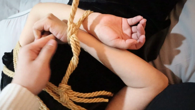 A一边挣扎着一边用她被捆起来的小手抓住挠她的身体部位的那只大手