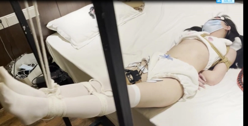 先将小茜带好手铐,然后捆绑在沙发床
