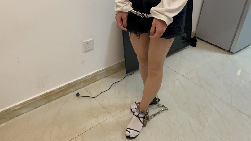 室内,罗菱菱穿着日常的裙子,穿着黑色凉鞋(镜头开始是全身,然后放大,从上往下拍穿着鞋的脚的特写,约两分分钟)。然后小茜拿着短牛仔裤和白色T恤,去房间换上短牛仔裤和T恤,脚上穿着黑色凉鞋出现在镜头面前。(镜头移动。相机倾斜60度这样,拍大腿到脚的下半身部分,就是大腿和脚要同框。再镜头放大,特写穿鞋的脚)。然后坐凳子上,慢慢脱下凉鞋,穿上船袜,穿上运动鞋,戴上手铐和脚镣,来回走动一下。然后坐在凳子下,慢慢脱下一只脚的运动鞋和船袜,穿上凉鞋。再脱下另一只脚的运动鞋和船袜,穿上另一只脚的凉鞋。把手铐打开,双手背在后面,走来走去,拿起手机,玩一下手机(镜头多拍一下模特穿着凉鞋的脚,多拍一下下半身部分)。