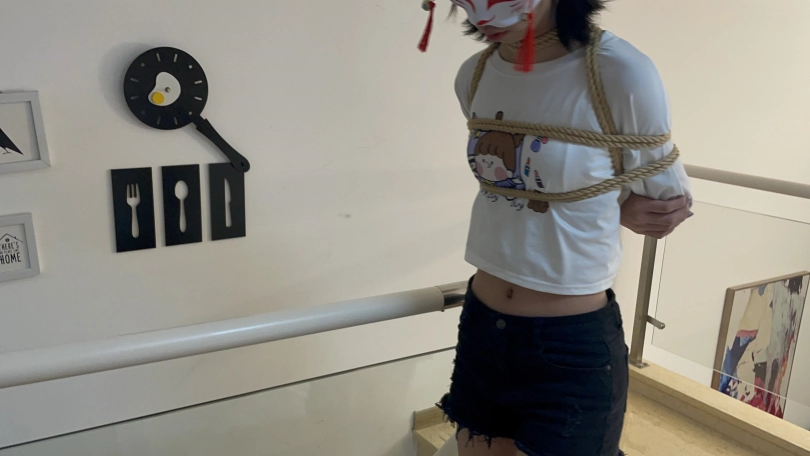 后来将罗菱菱来了一个蕾脖式五花大绑,牵着她上楼梯,脚上靠着脚链,上楼了之后和她安排了一个任务
