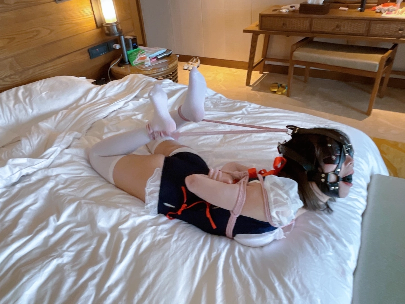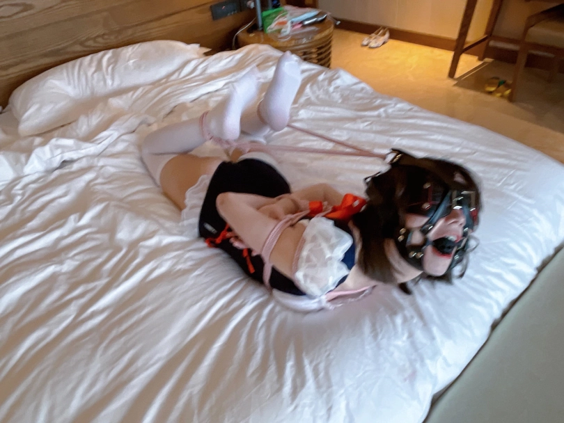 两种绑法:一种经典V字极限抬头驷马,双脚脚腕用一根绳穿过马具口球的头顶后收紧,两个脚腕互相拉扯就会互相收紧,完全强迫挺胸抬头提臀 ,动弹不得。