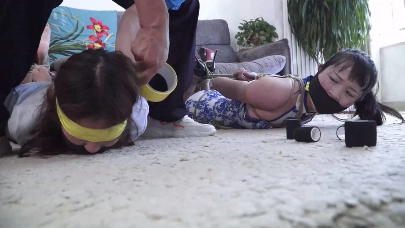 随后锁哥用黑色胶布分别封在二女嘴外5张,再拿黄色胶带缠绕5圈,黑色弹力自粘绷带缠绕5圈,把二女嘴封堵得结结实实。完事后二女愤怒不服气还瞪向锁哥,锁哥一看嘿你们玩打赌游戏没挣脱开输了还不服气埋怨我,干脆拿黄色胶带和黑色自粘绷带缠绕将二女眼睛也封严实,而后自己笑着离开外出了,说等回来自己给二女解开。