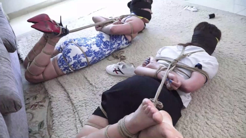 炎热夏日到了,女孩家欣和穿青花色旗袍的好闺蜜亚男觉得无聊没啥事干,家欣的表哥锁哥提议玩个打赌游戏,自己拿绳索把家欣亚男两女捆绑起来,塞住嘴巴,只要二女当中有一个人能在限定时间挣脱开,自己就分别给二女一笔钱。