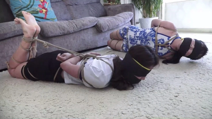 二女坐在沙发上开始挣扎,可没想到锁哥捆绑技术不错,二女绞尽脑汁怎么挣扎都无济于事,期间她们还互相埋怨,后来发现不是个事就试图背靠解绳,可解了半天也还是啥用没有。
