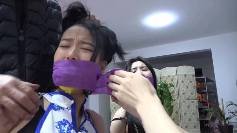 随后柳洋锁哥用黄色宽胶布分别剪下5张封在二女嘴外,用黑色胶带和紫色弹力自粘绷带分别在二女嘴外缠绕5圈,将他们嘴封得严严实实。