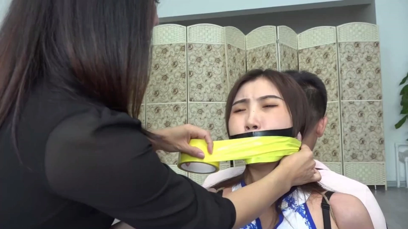 情节:穿青花色旗袍的美女阿琳从昏迷中醒来,吃惊地发现自己被人五花大绑,双腿脚踝并拢捆绑多道,口中被带上塞口球,整个人被紧紧束缚住。
