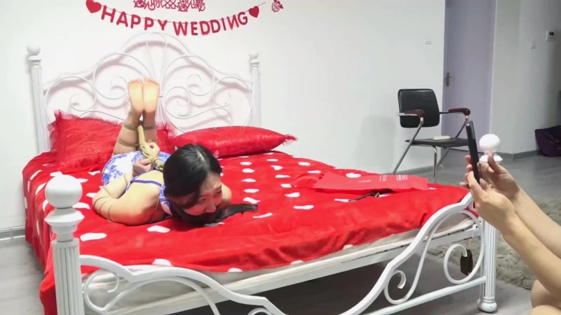 琪琪长期在公司与大姐大同事李然作对,被李然逮住机会入室劫持捆绑,嘴里带上了塞口球呜呜坐在床上晃动穿着黑色短丝袜的双脚挣扎。