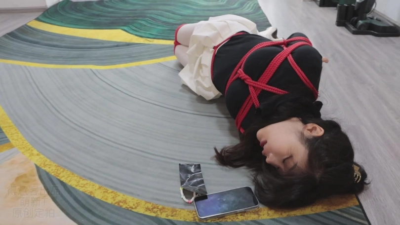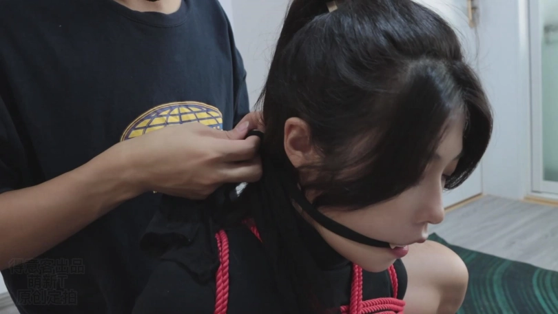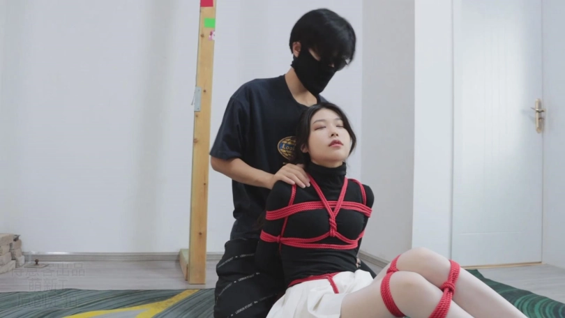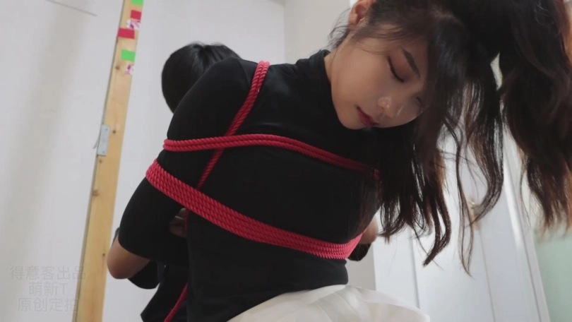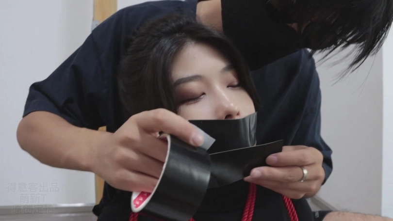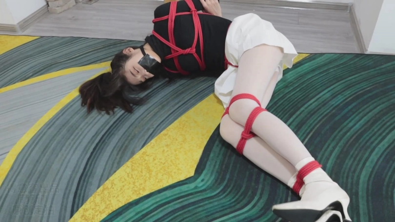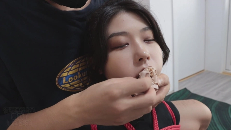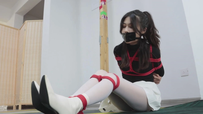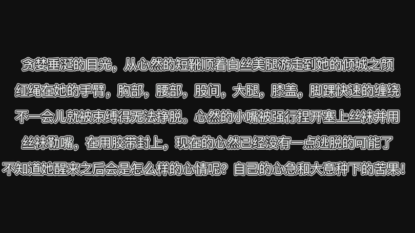 不一会儿就被束缚得无法挣脱。心然的小嘴被强行捏开塞上丝袜并用