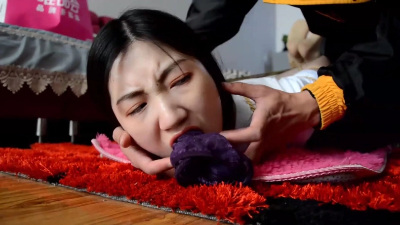 片段5:模特吴晗被一条紫色脏内裤和一条黑色原味脏内裤两条内裤塞满嘴,嘴外被黑色电工胶布封住,嘴外缠绕黑色静电胶带与肤色弹力自粘绷带。