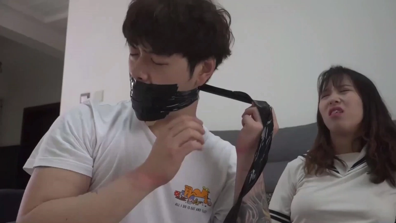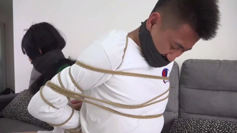 (八)下班回家和自己老公一起被捆堵折磨的美女若冰,最终挣脱束缚解除眼睛外和嘴外封堵,小两口互相安慰对方平安就好,同时准备休息休息报案去抓坏人。