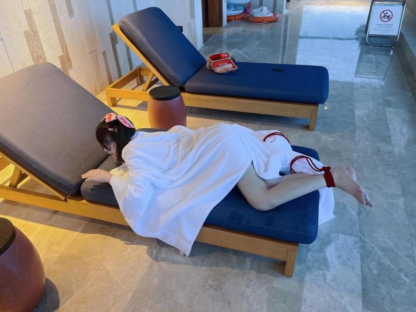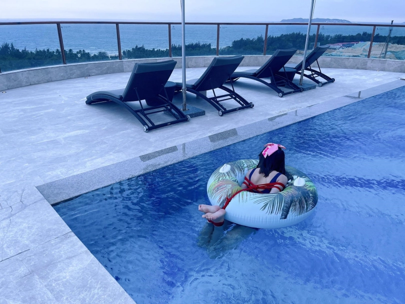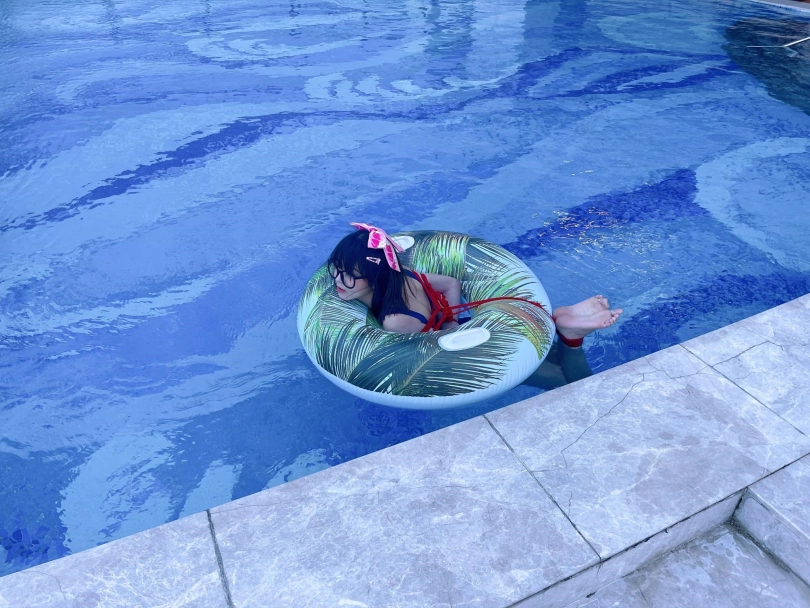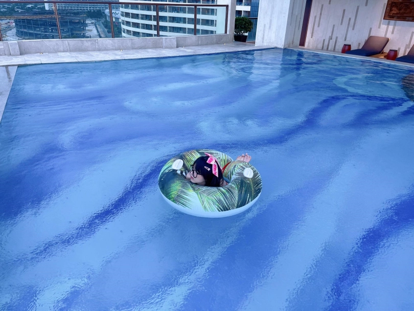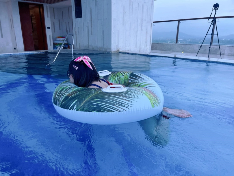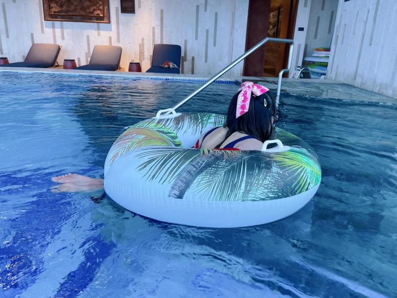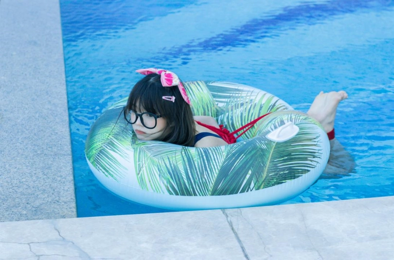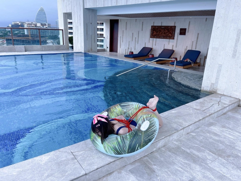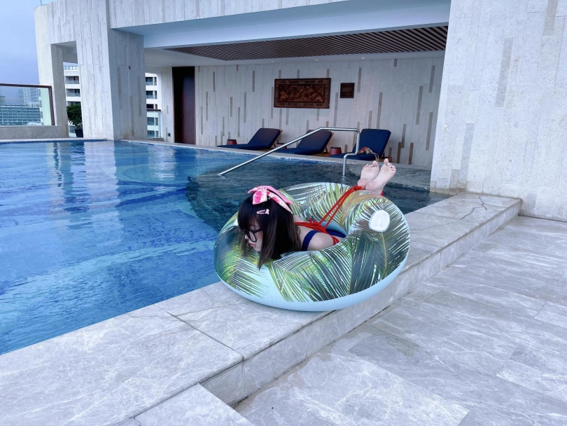 这次出去玩包了酒店三层,包括一个室外的海景泳池。正好提供了泳圈,又看到了穿着死库水玩水的茶茶...所以就把茶茶驷马绑在泳圈上,任由茶茶漂浮在水面。