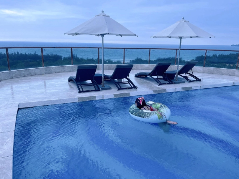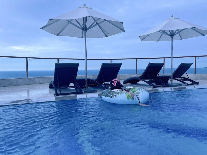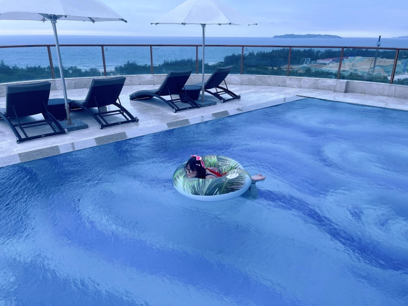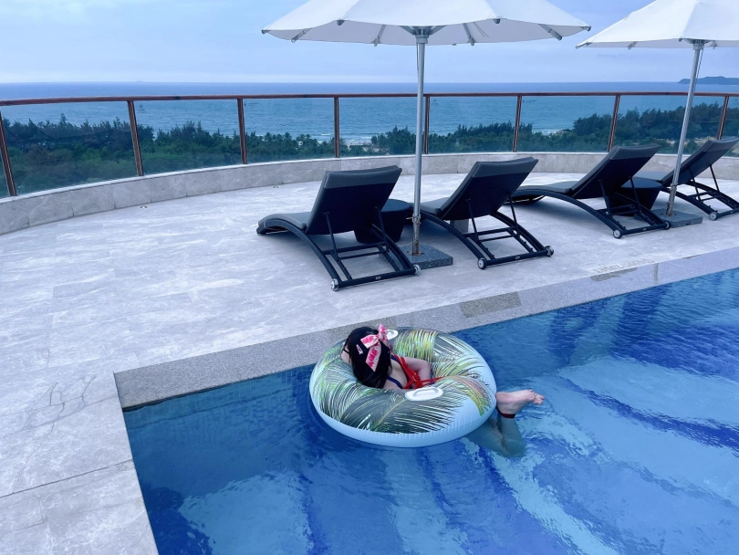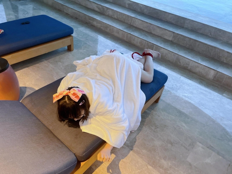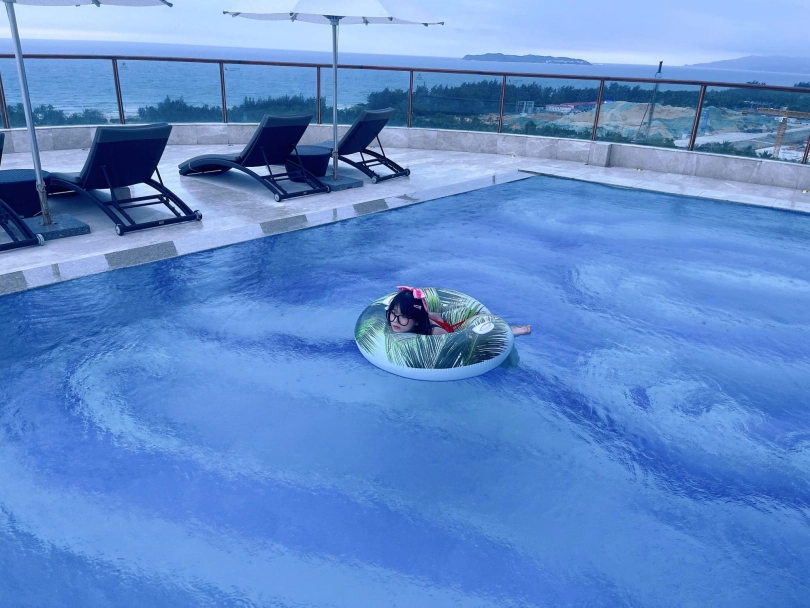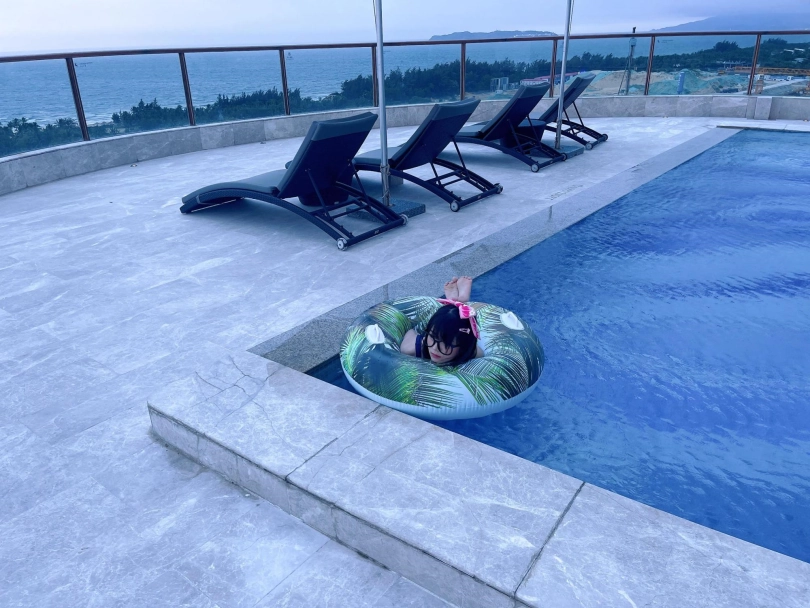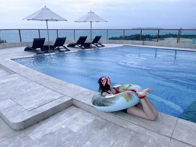 这次出去玩包了酒店三层,包括一个室外的海景泳池。正好提供了泳圈,又看到了穿着死库水玩水的茶茶...所以就把茶茶驷马绑在泳圈上,任由茶茶漂浮在水面。