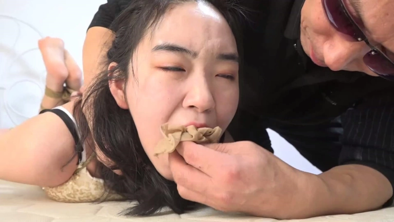 为了惩罚林丹丹想跑,锁哥拽出她口中红色脏内裤丢掉,给她换了一条同样穿了几天没洗的肉色原味连裤丝袜一点点堵嘴。(注:这里一开始塞太快没堵严实,肉色裤袜掉出来了,而后男演锁哥一点点把这条裤袜先从裆部塞,再把两条袜腿一点点捅进林丹丹嘴里,细致展现塞嘴过程。)