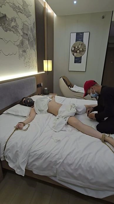 【小黑】嘴里塞着袜子,胶带堵嘴蒙眼,床上大字缚,一直呜呜说话,听不懂说的啥,玩具放在最敏感地方,放置反复折磨,素人真实反应。