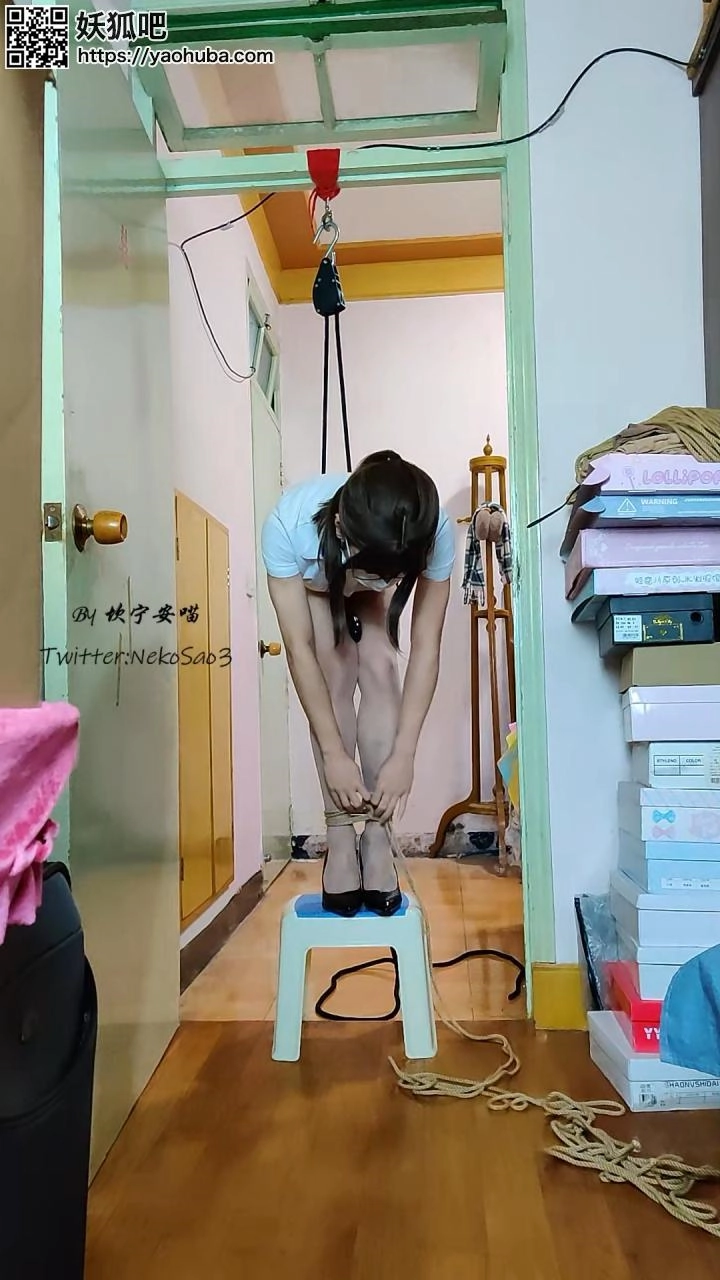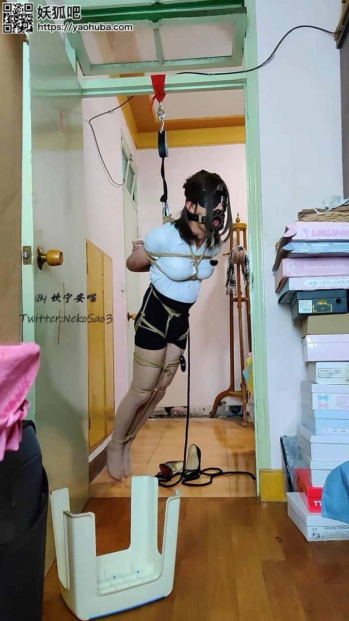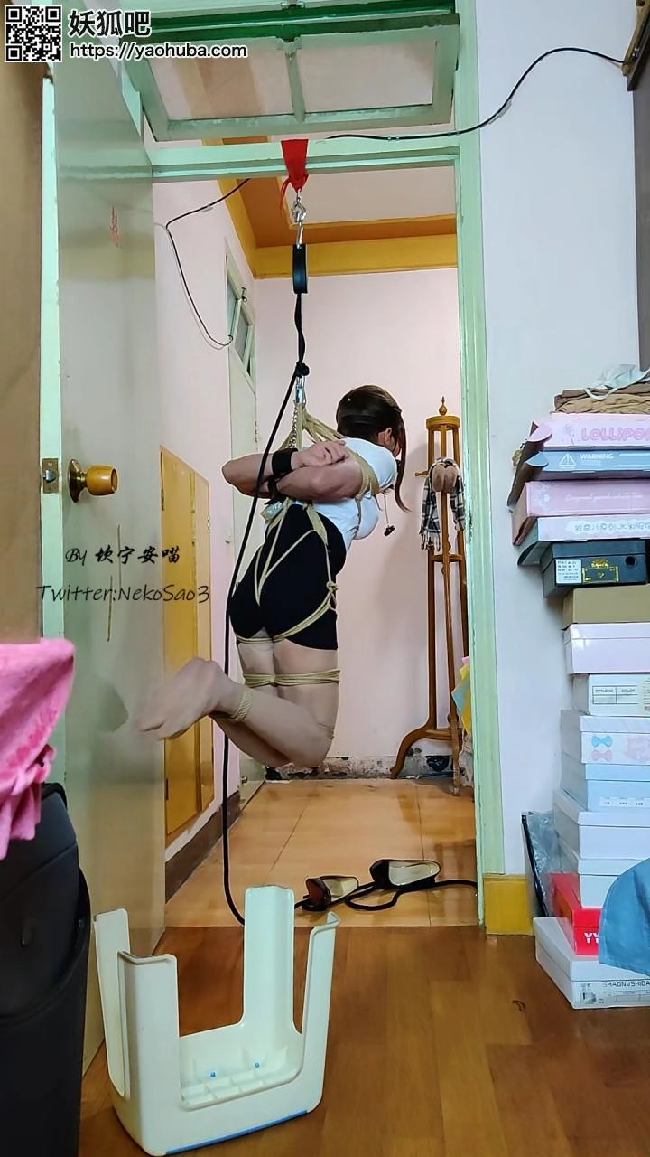 用绳子将上半身的绳子和股绳连接再挂到吊钩上然后吊起,就会勒紧股绳,穿着高跟鞋的时候是勉强踩地,脱掉高跟鞋就只能被迫踮脚了~