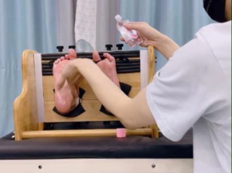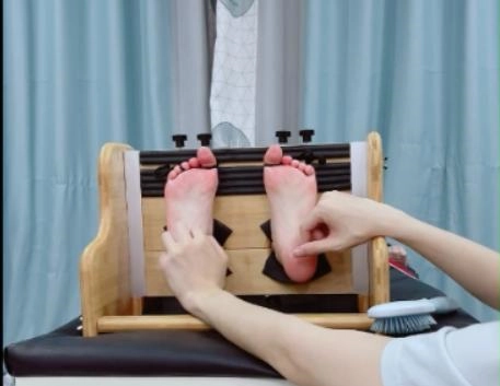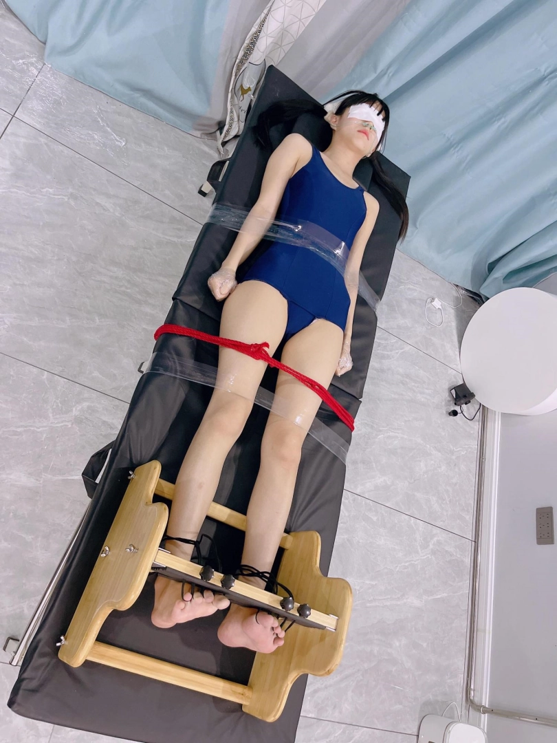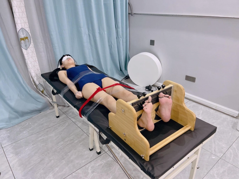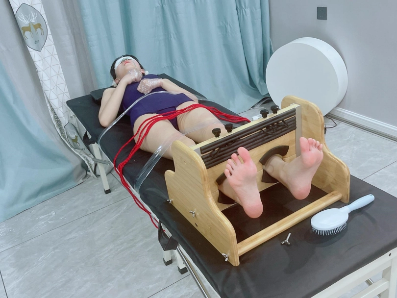 这次把茶茶的手用缠绕膜握拳缠绕后固定在痒刑床上,双脚也固定在足枷上,脚趾也绑好。这样,脚心的嫩肉就完全暴露了。