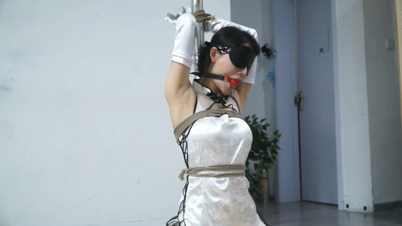 女奴来到拘束台前,主人为其解下项圈;并要求女奴戴上长手套,然后驱赶着女奴坐上拘束台。女奴背靠铁柱而坐,双手被主人高高拉起到铁架后,用绳子紧紧绑在铁架上。