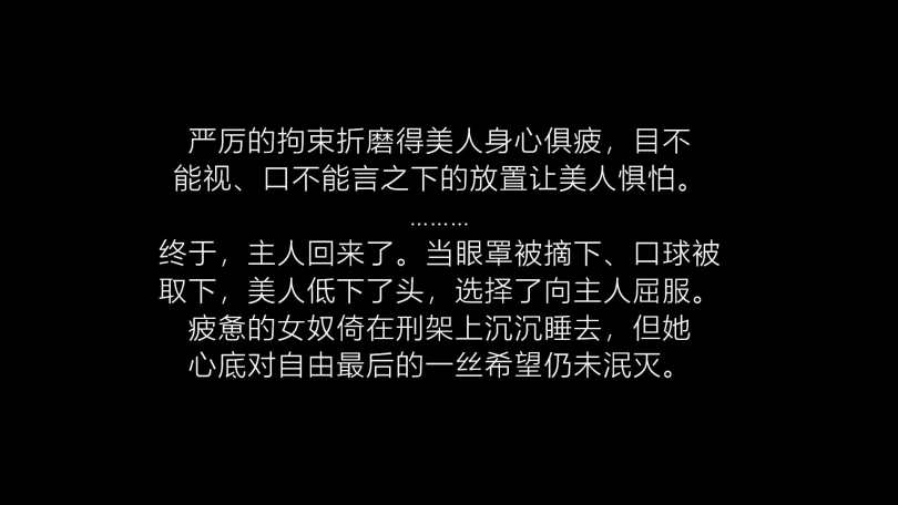 主人终于满意了,遂将女奴从拘束台上解开。疲惫不堪的女奴倚在架子上昏睡过去……