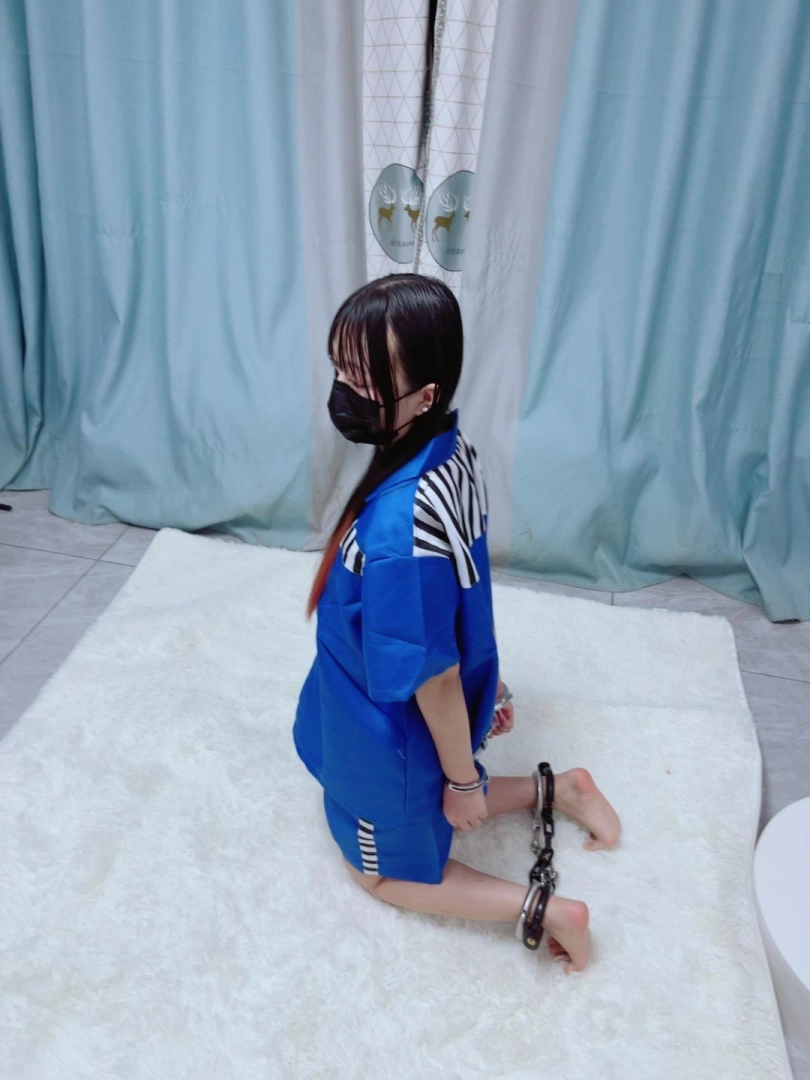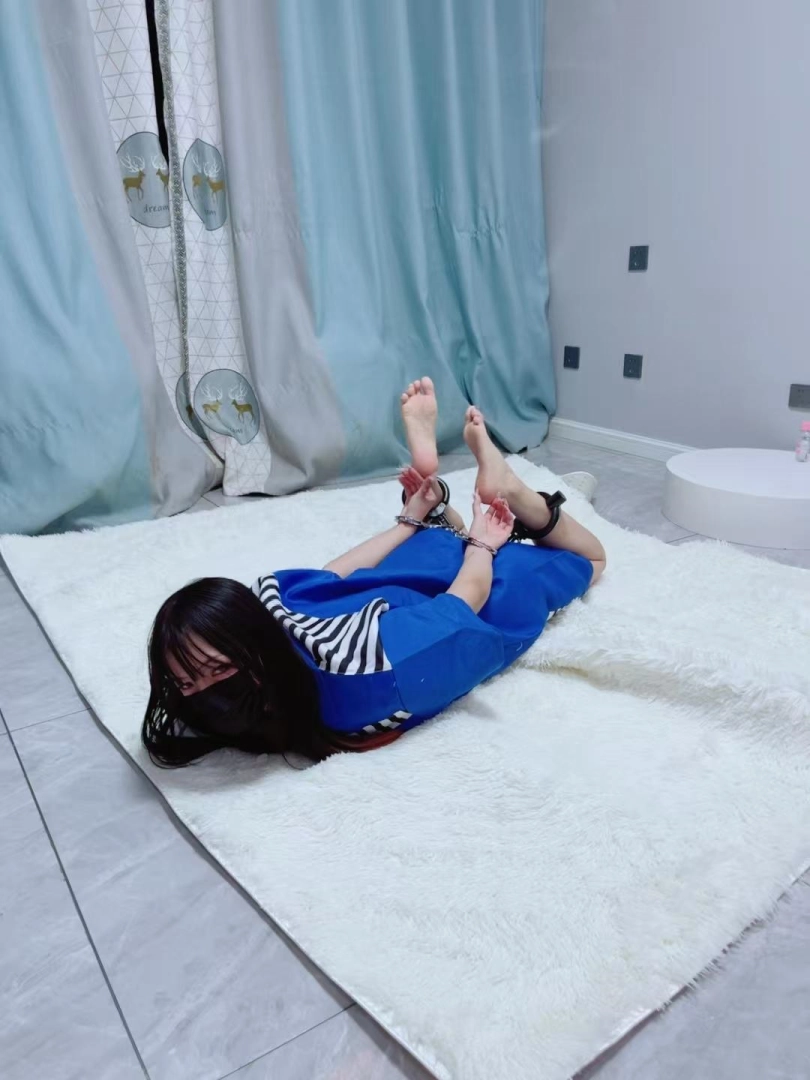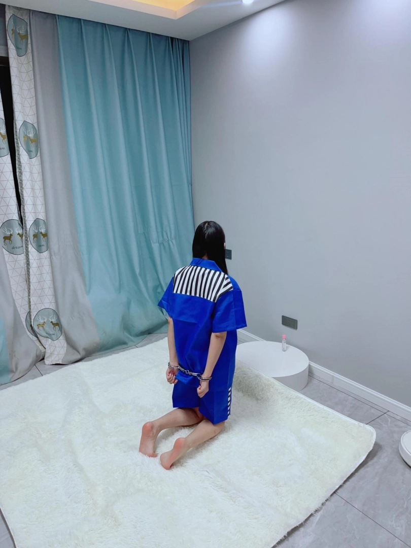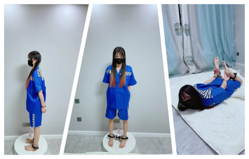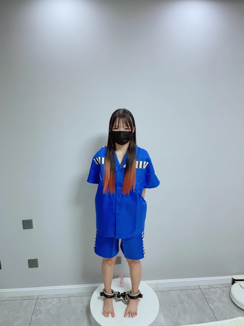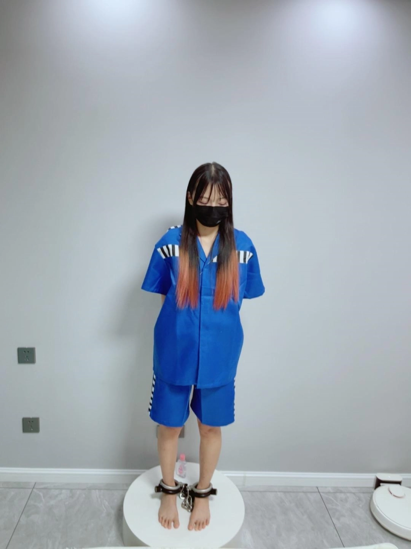 首先给糖糖戴上最严厉的板铐,反铐在身后,然后给糖糖戴上女死囚级别的重型脚镣(10斤),期间糖糖略有不满,作为惩罚又加了一副重镣!