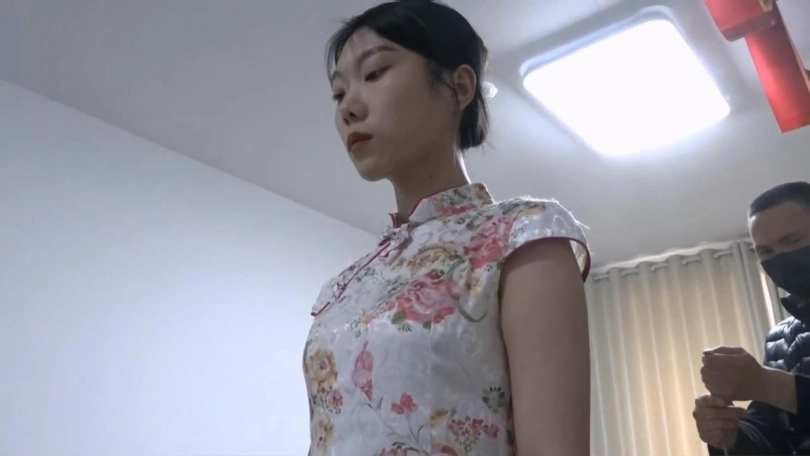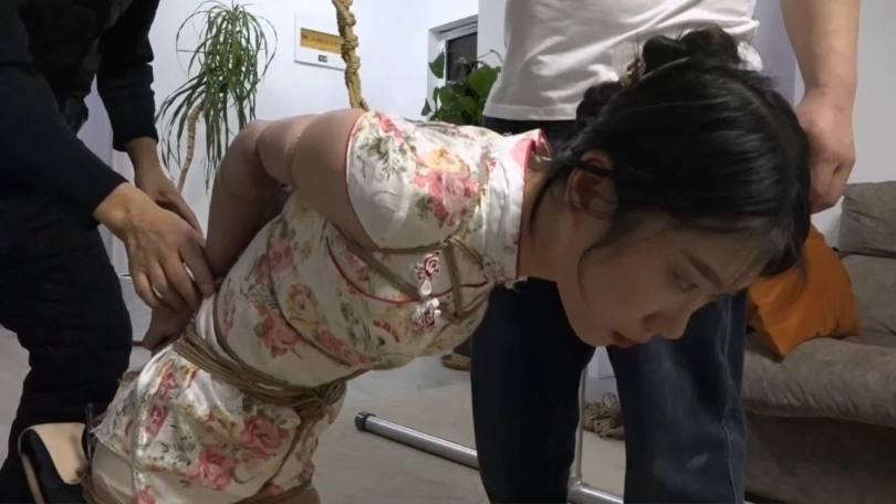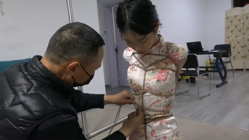 高冷颜值配紧身小旗袍还挺适合,这次给绑的比较狠,绑成欧式直臂然后膝盖顶地跪缚后手吊,模特的手都给绑紫了,看表情也知道这个姿势不太好受。