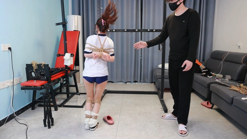 第一项挑战是捆绑手脚在鞋子上跳50个来回,消耗模特的体力。