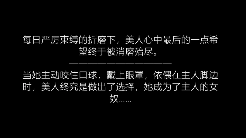 说罢,主人拿出头套要给女奴戴上。女奴一边哭喊一边挣扎抵抗,但是主人还是给已经被绑好的女奴戴上了头套,又拿出口球给女奴戴上。主人看着呜呜直叫的女奴,狞笑着说:“既然是奴隶母畜,就没有说话的必要了,好好含着口球吧。”