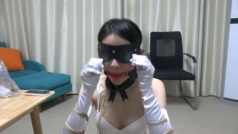 主人先拿起头套要给女奴戴上,女奴哀求主人不要戴头套,能不能只戴眼罩。主人答应了,于是重新给女奴戴上眼罩和口球,然后把女奴抱起来调教玩弄,女奴表现得非常顺从