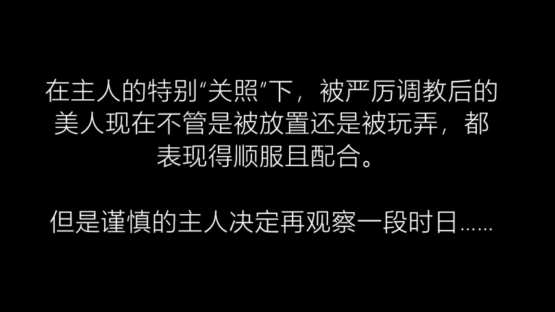 人回到家里,女奴高兴地呜呜叫。主人上前调教女奴,一会玩弄爱抚,一会用鞭子轻轻抽打,女奴配合地扭动和呻吟。调教满意后,主人将女奴解下来,揽着她走进屋子里。