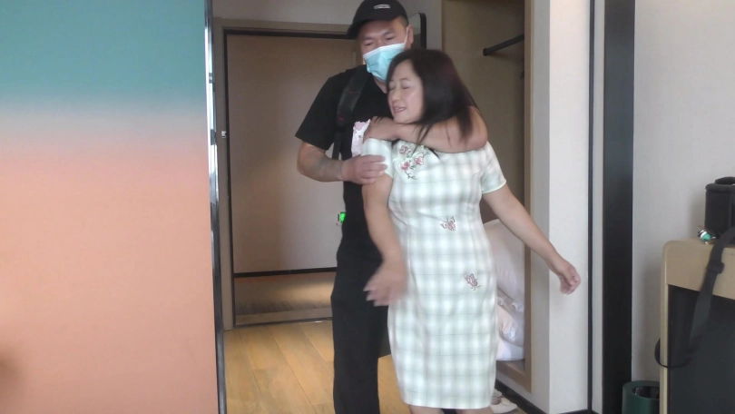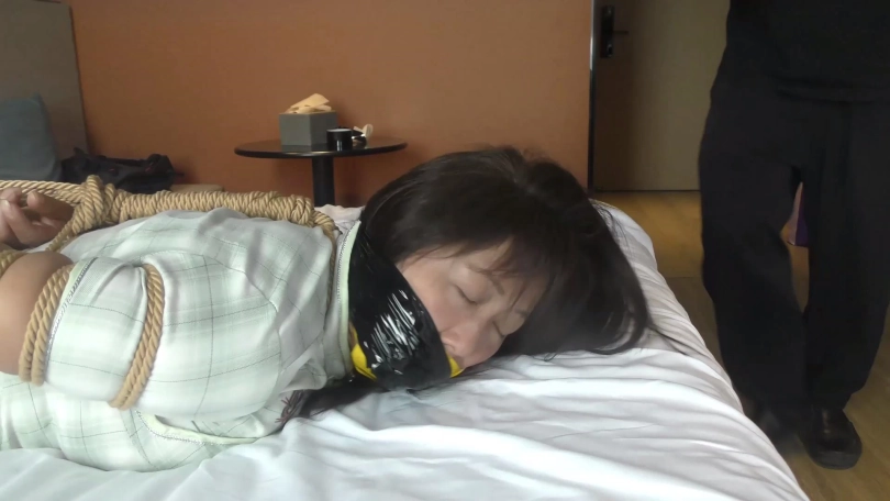 歹徒去翻找财物,老阿姨奋力挣扎弄松绳结,准备解开绳子逃跑,但被歹徒发现严厉捆绑并捆成驷马。