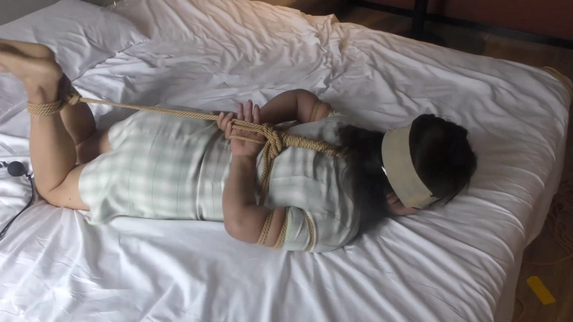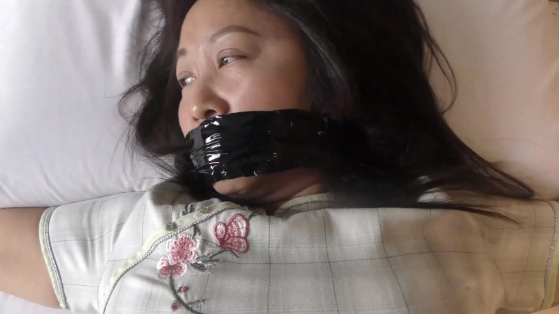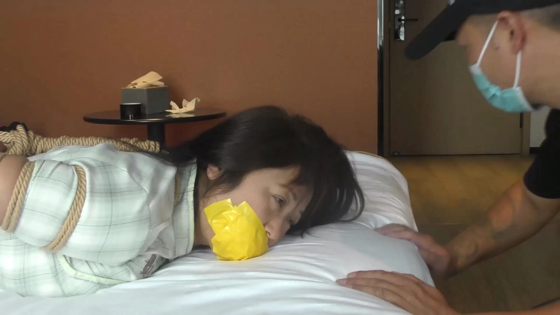 歹徒脱掉老阿姨脚上穿的一双肉色锦纶丝袜,撕开封嘴胶带把短丝袜拽出丢掉,强行把原味肉色锦纶丝袜一只只塞到老阿姨口中,外面用黄色强力胶布封好,再缠绕黑色胶带多圈和自粘绷带封严实。