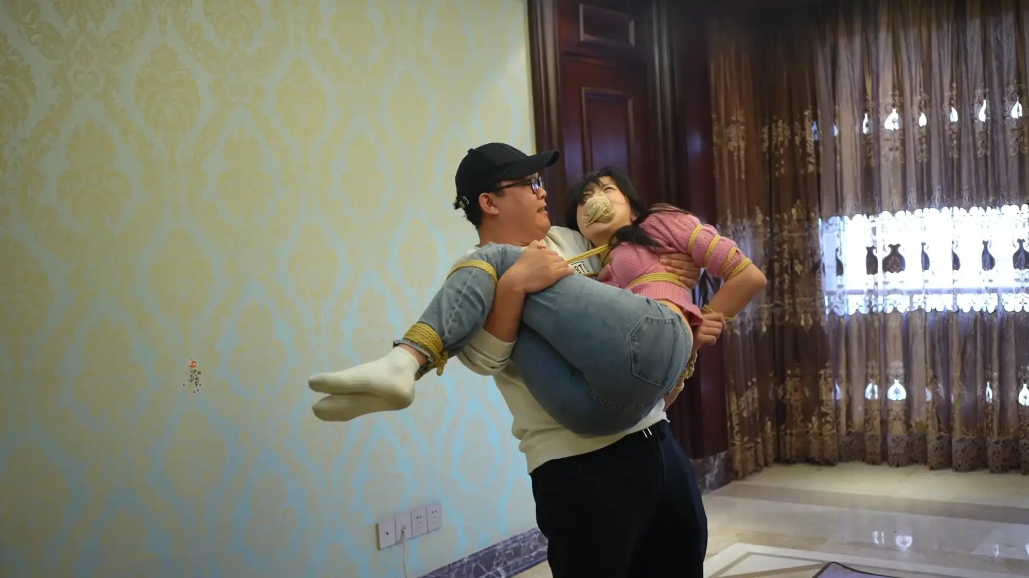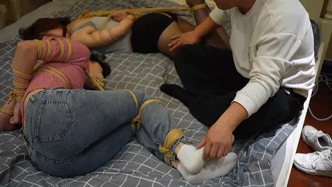 玩累的房东随后将母女两人抱到了卧室,将米粒驷马捆绑后开始挠两人的脚心,最后锁上房门任由母女两人在床上挣扎。