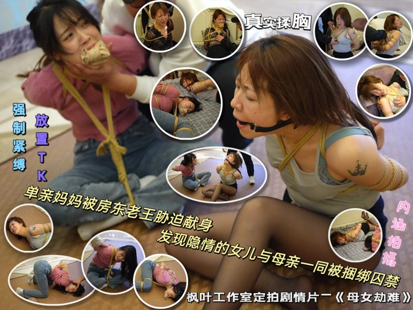 片刻过后,被五花大绑的母女两人苏醒,小智呵斥房东放开她们两人,米粒告诉了小智实情,小智大骂房东是趁火打劫。愤怒的房东将小智的头按在地上,准备好好教训下她,米粒求情放过小智,房东为了让小智知道厉害,将她桃缚防止乱动,并当着小智的面玩弄米粒,小智不停挣扎倒在了地上,房东又将她并腿团缚,继续玩弄米粒,被丝袜堵嘴的小智只能在一旁眼睁睁的看着。