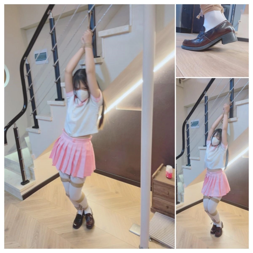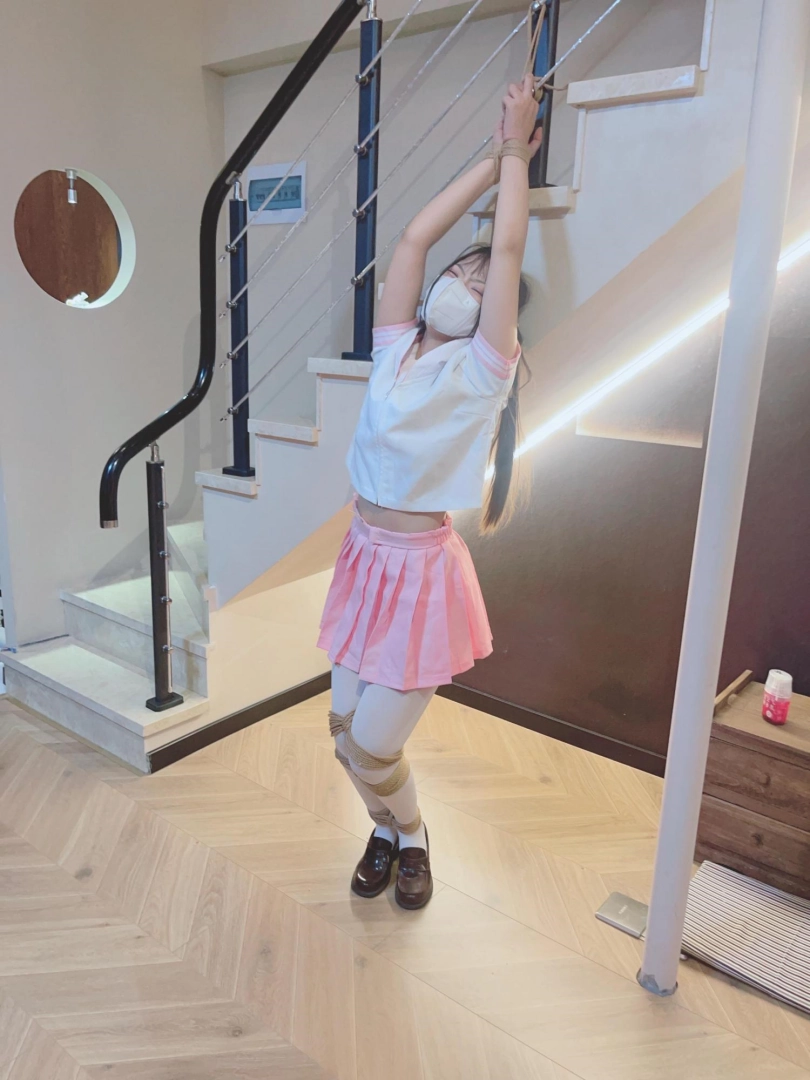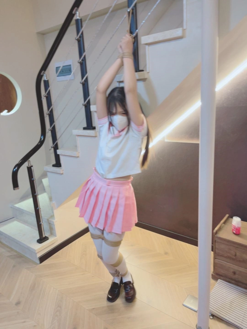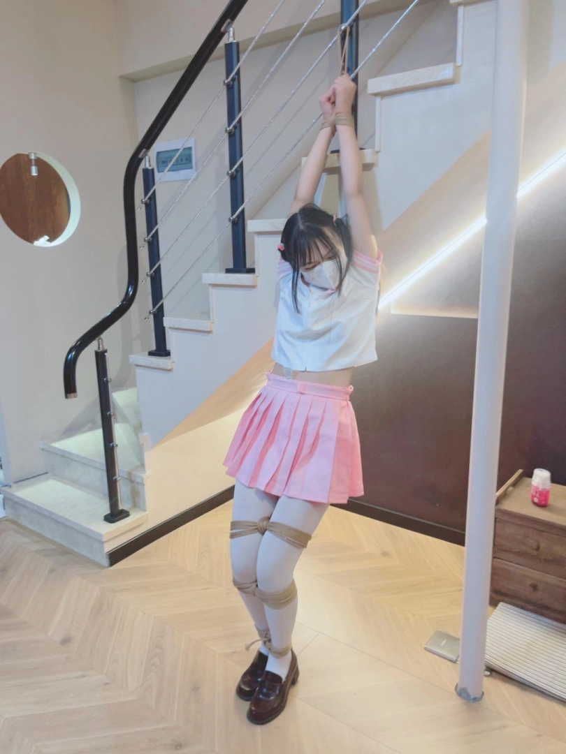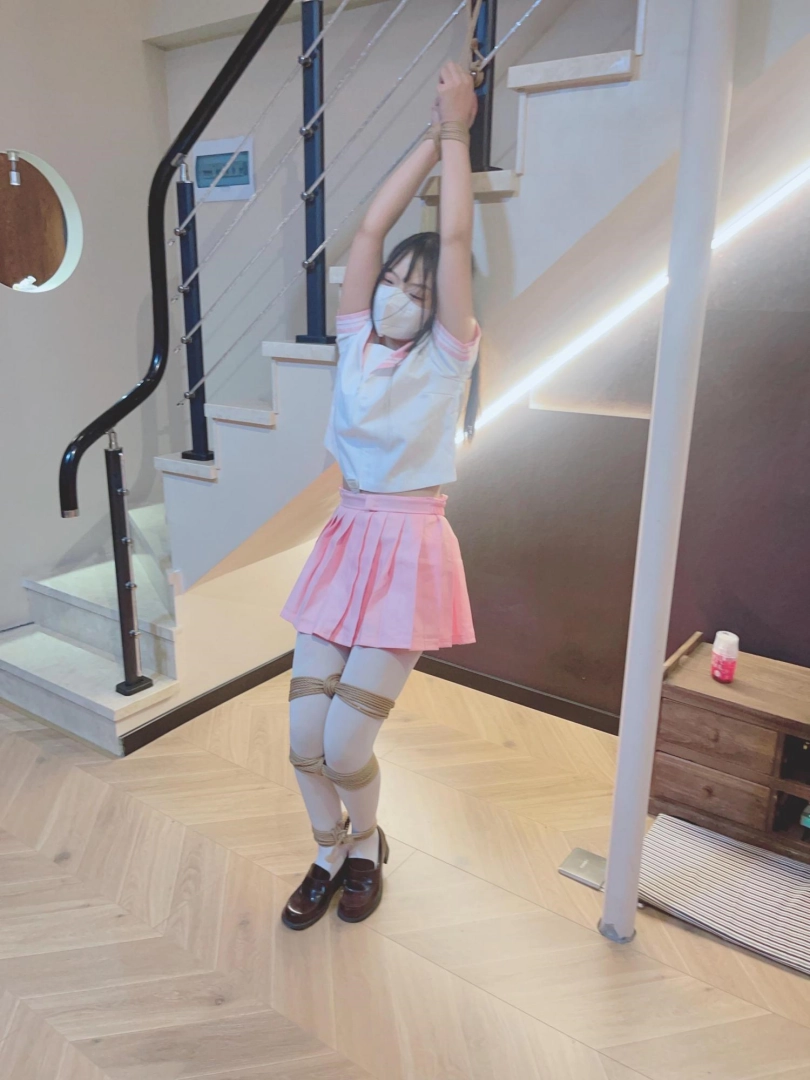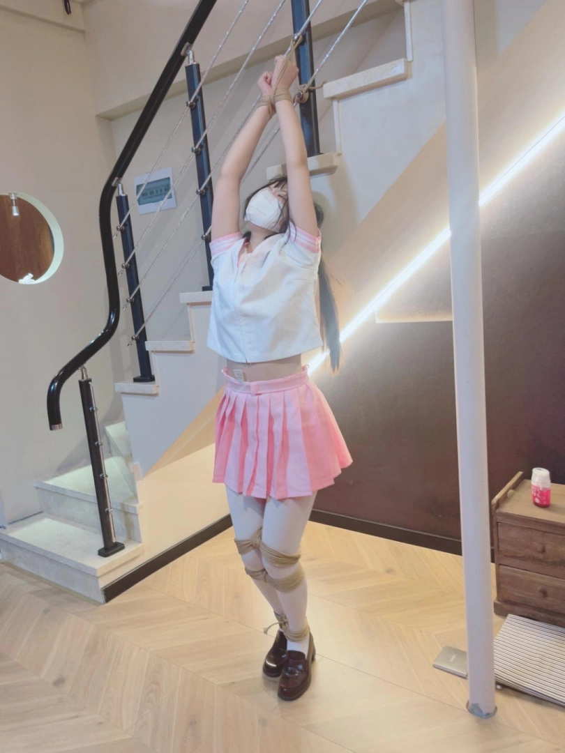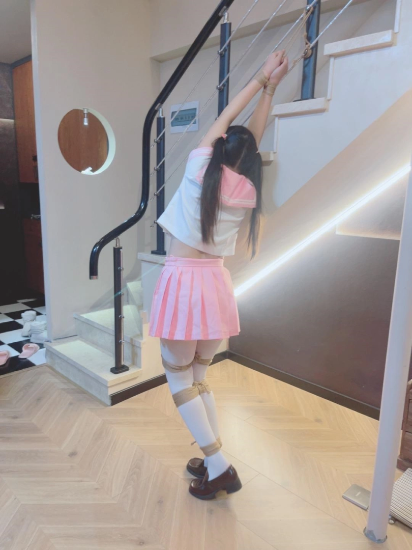 让糖糖穿上可爱的粉色jk制服,穿上jk小皮鞋(这短暂的换装时间也是她唯一能休息的时间了),然后用多道绳子紧紧拘束大腿、小腿、脚腕。然后把手腕拉到最高,直到强制踮脚脚尖才能勉强接触到地面为止。如果放下脚,绳子就会狠狠勒紧手腕,并且手臂承受全部体重~算是个简单的predicament吧~
