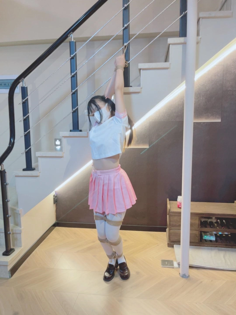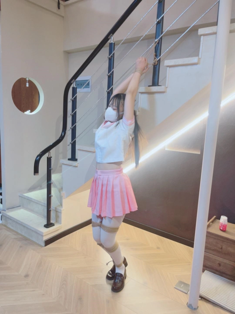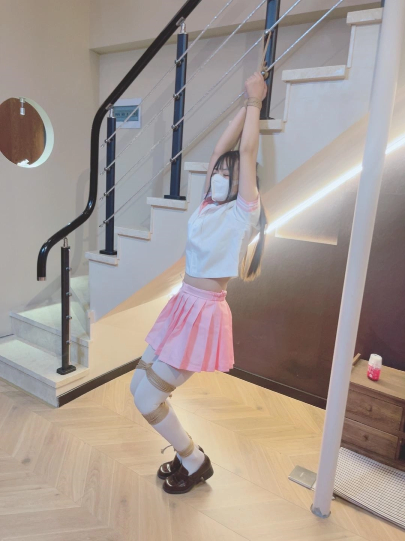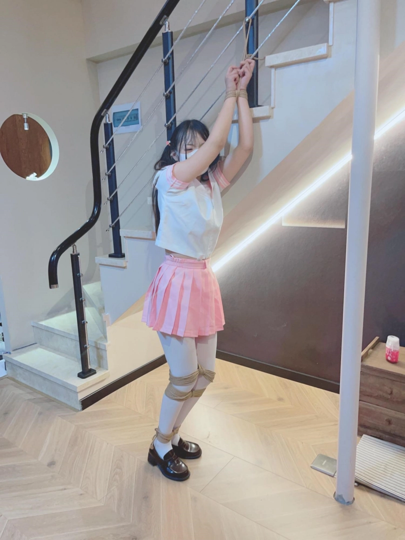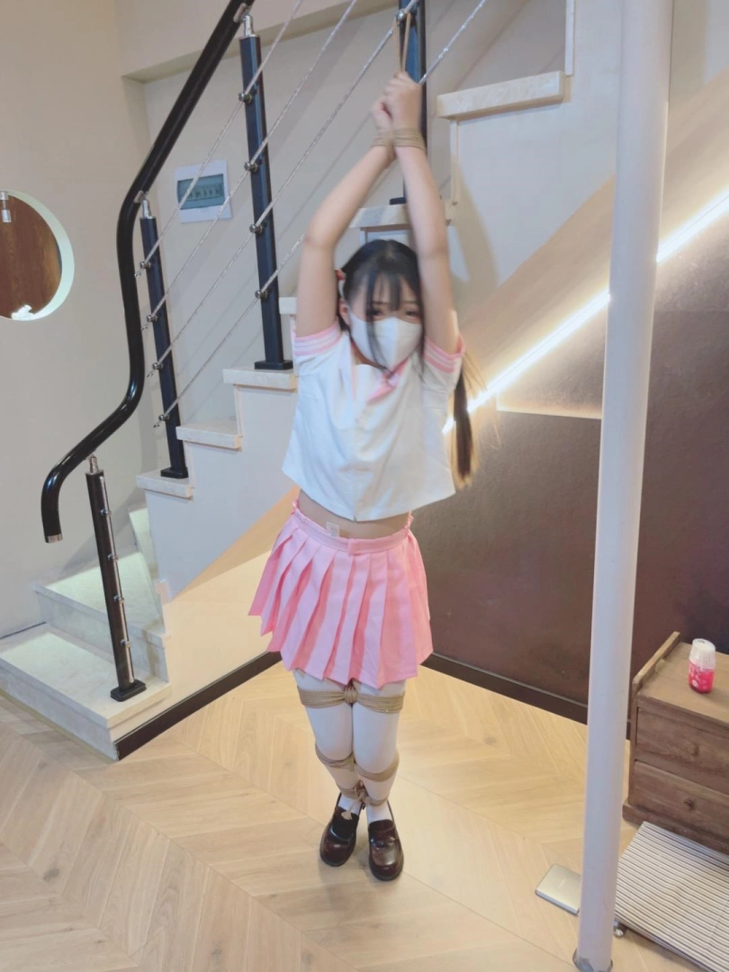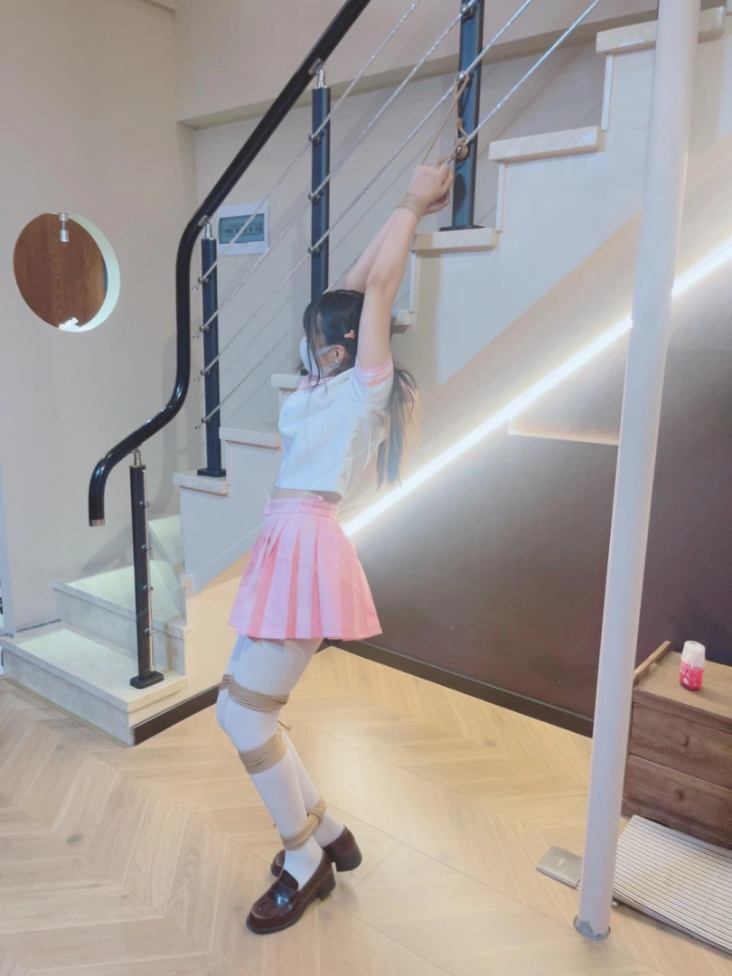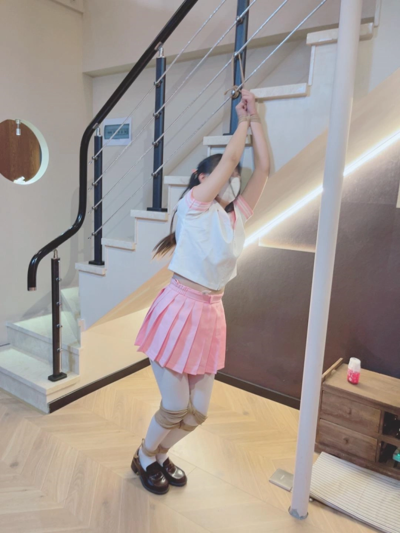 让糖糖穿上可爱的粉色jk制服,穿上jk小皮鞋(这短暂的换装时间也是她唯一能休息的时间了),然后用多道绳子紧紧拘束大腿、小腿、脚腕。然后把手腕拉到最高,直到强制踮脚脚尖才能勉强接触到地面为止。如果放下脚,绳子就会狠狠勒紧手腕,并且手臂承受全部体重~算是个简单的predicament吧~