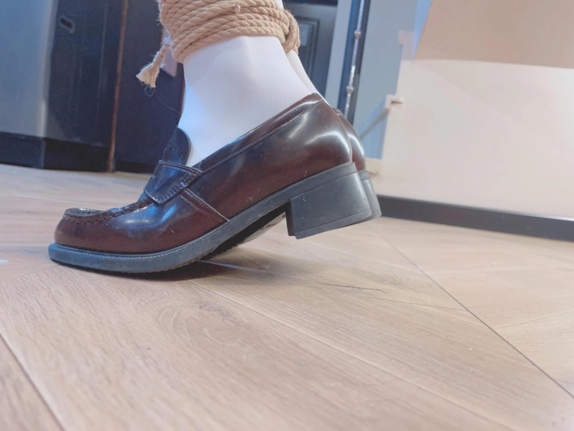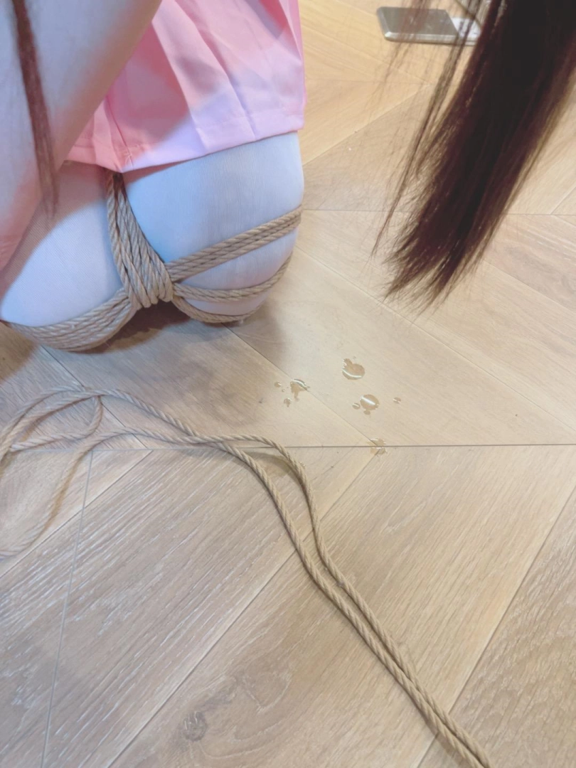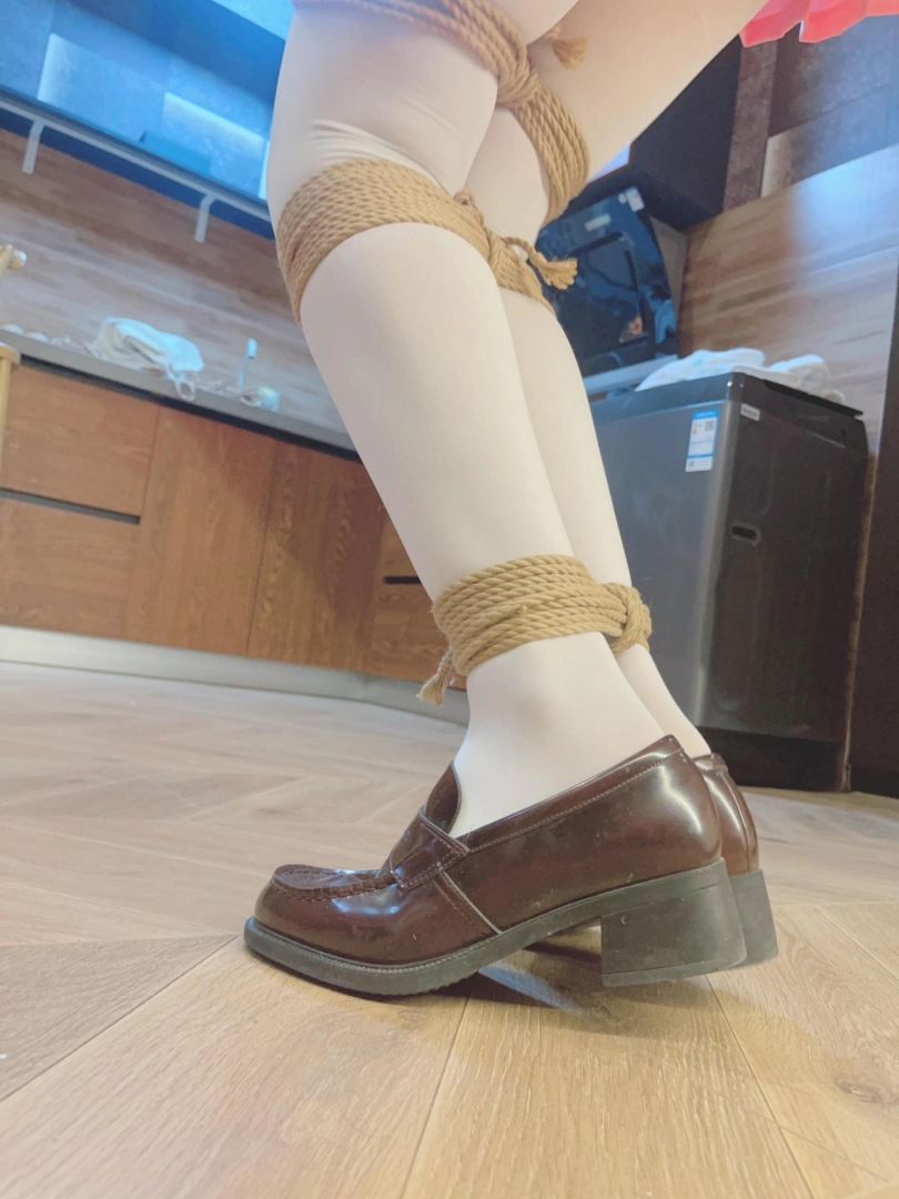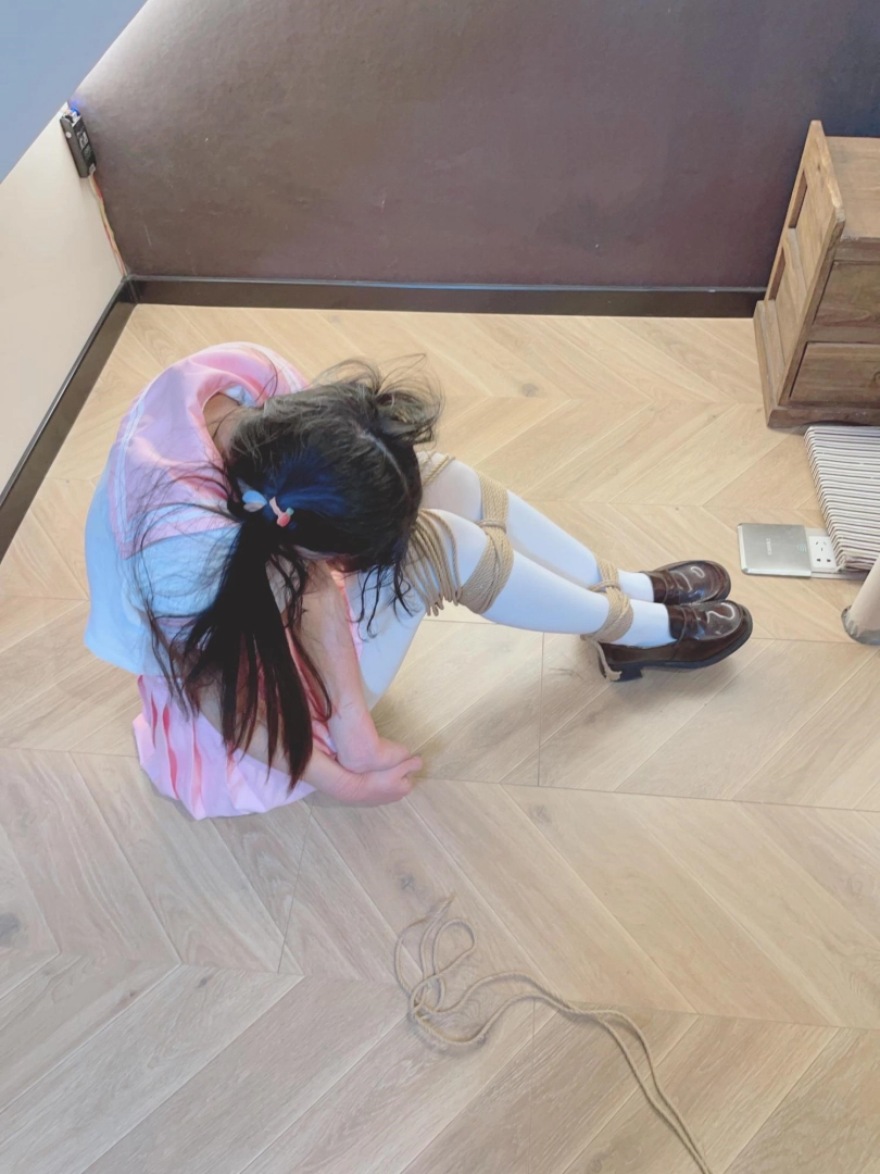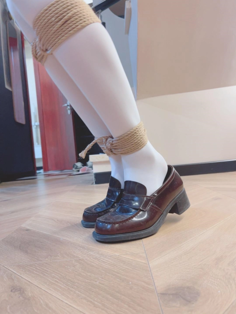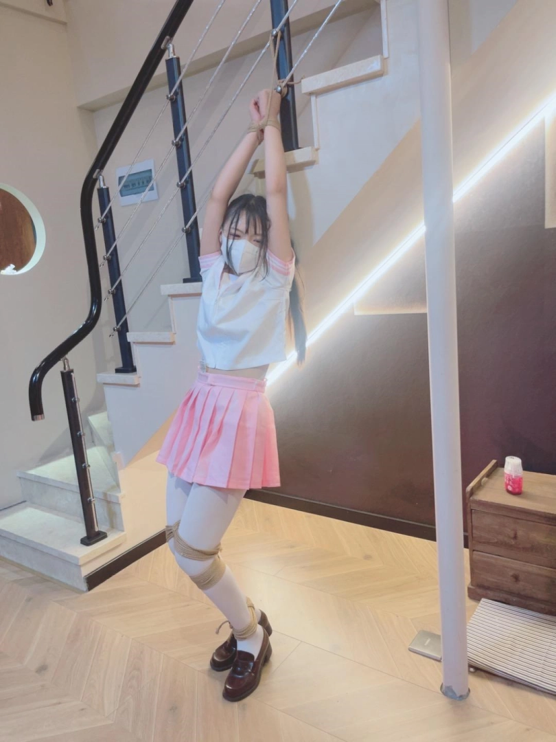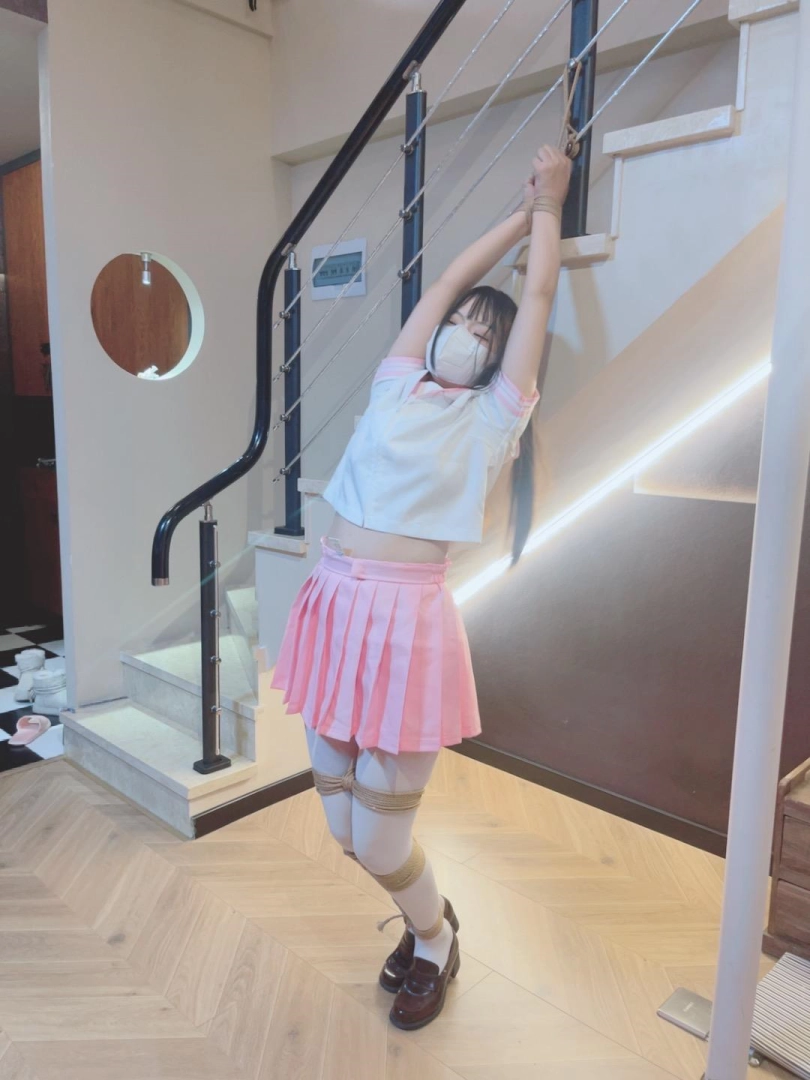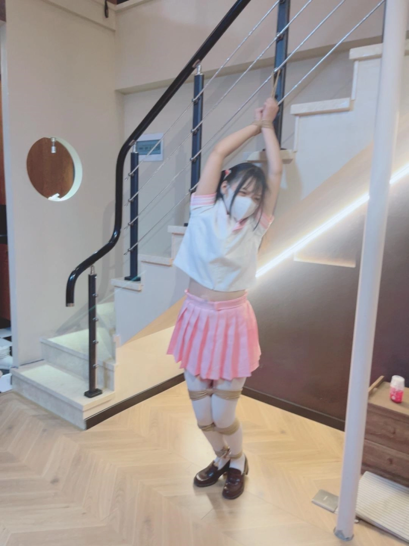 让糖糖穿上可爱的粉色jk制服,穿上jk小皮鞋(这短暂的换装时间也是她唯一能休息的时间了),然后用多道绳子紧紧拘束大腿、小腿、脚腕。然后把手腕拉到最高,直到强制踮脚脚尖才能勉强接触到地面为止。如果放下脚,绳子就会狠狠勒紧手腕,并且手臂承受全部体重~算是个简单的predicament吧~