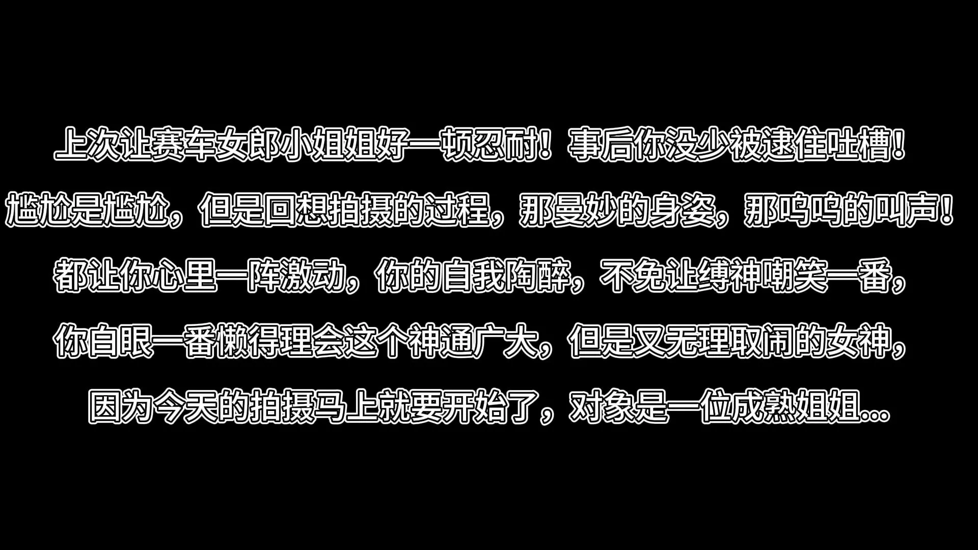 上次让赛车女郎小姐姐好一顿忍耐!事后你没少被逮住吐槽!尴尬是尴尬,但是回想拍摄的过程,那曼妙的身姿,那呜呜的叫声!都让你心里一阵激动,你的自我陶醉,不免让缚神嘲笑一番,你白眼一番懒得理会这个神通广大,但是又无理取闹的女神,因为今天的拍摄马上就要开始了,对象是一位成熟姐姐...
