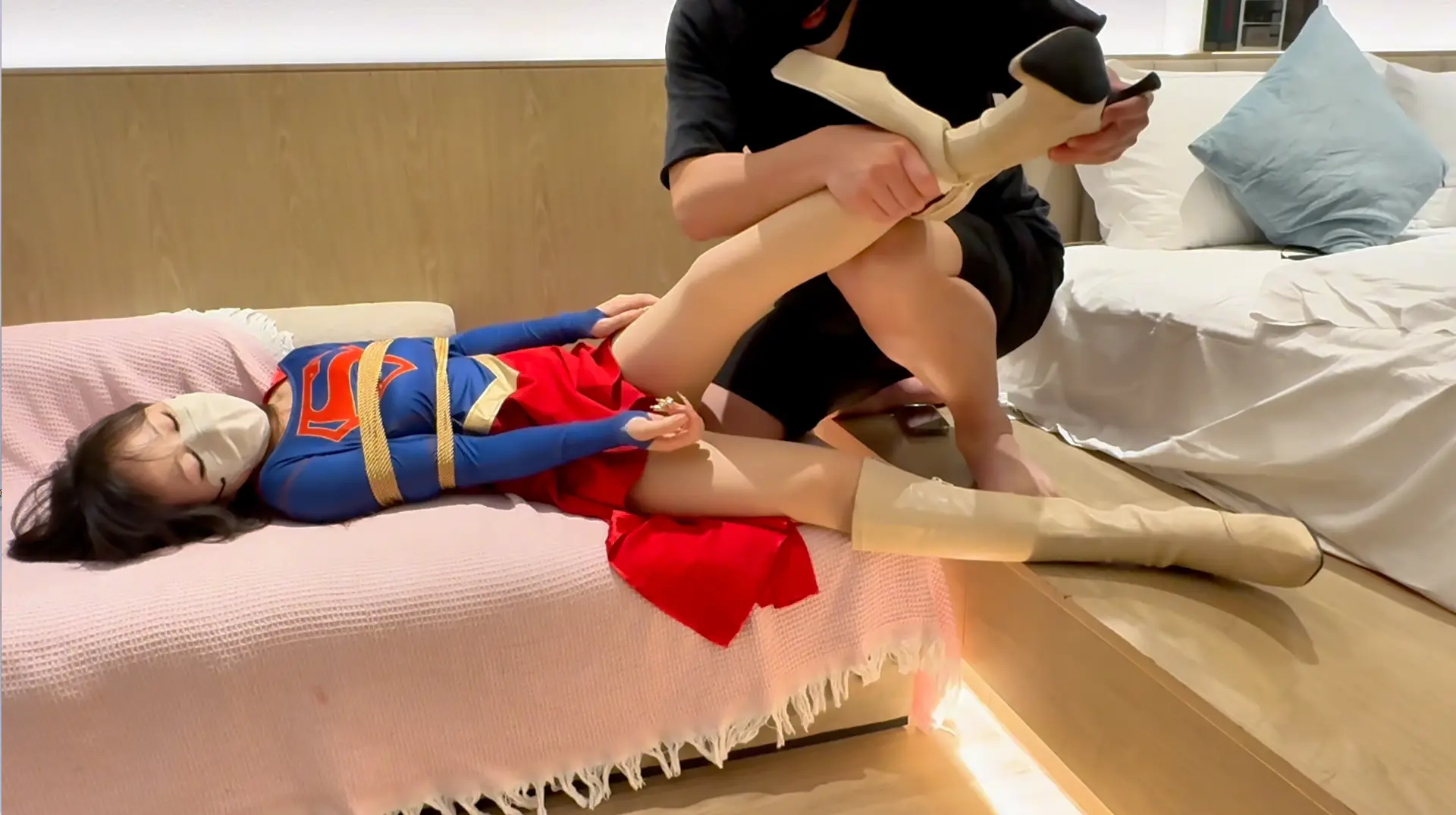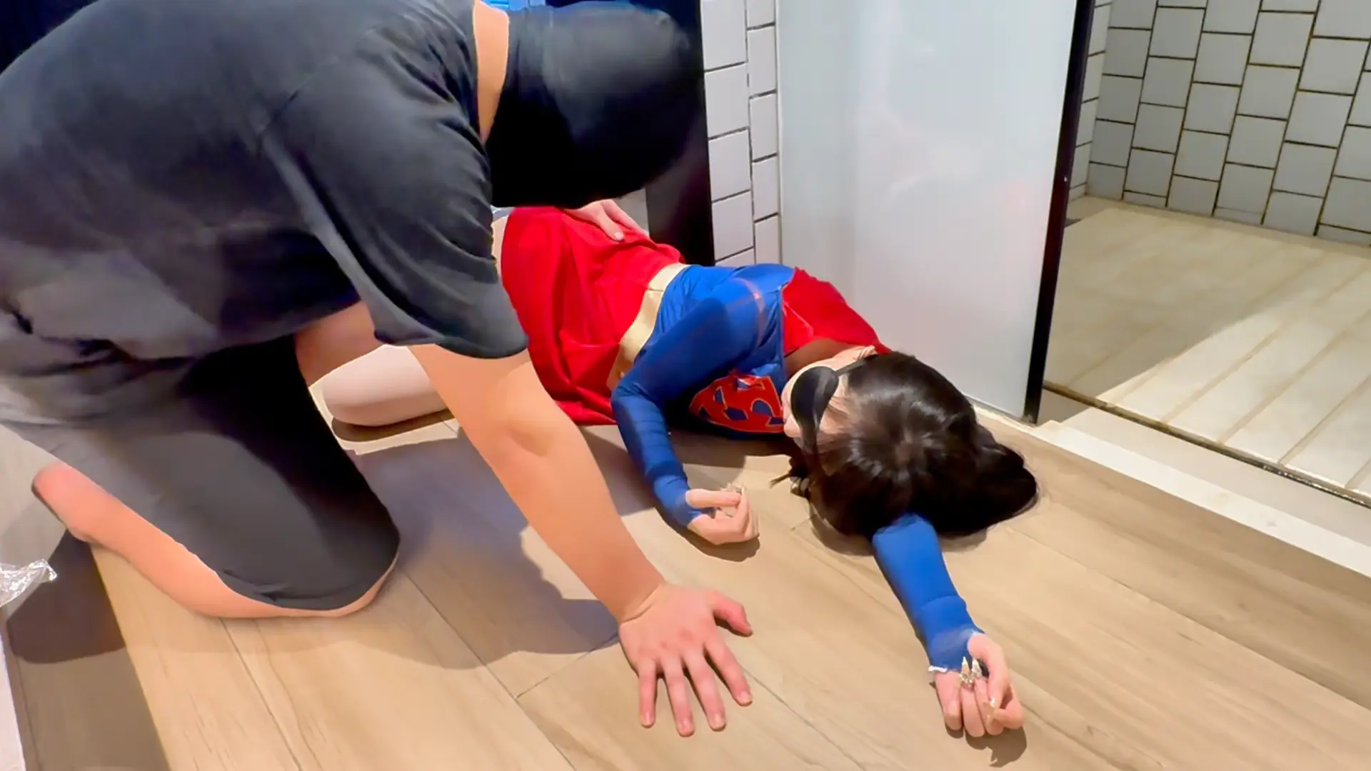 女超人经过大战后昏倒在屋内,碰巧遇到了小偷入室,小偷见色起意玩弄了一番女超人的身体并且与女超人舌吻,最后脱下女超人的靴子品尝女超人的白袜脚