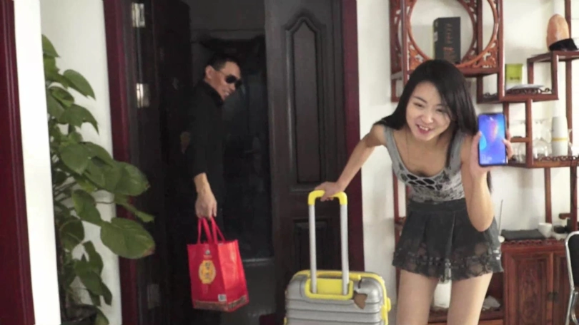 锁哥开门从外面进来,把门带上,手里拿着一个红色袋子,跟沙发上梁静打招呼。