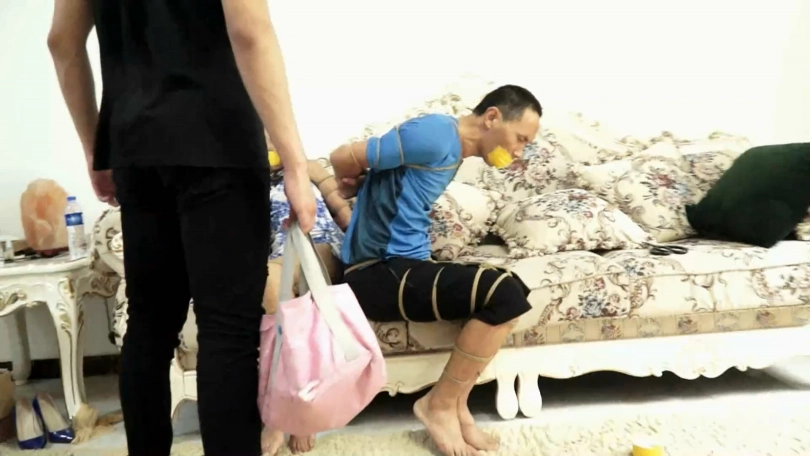 穿着青花旗袍的美女夏炎面带微笑回家,发现男友坐在沙发上被五花大绑,嘴里带着塞口球。