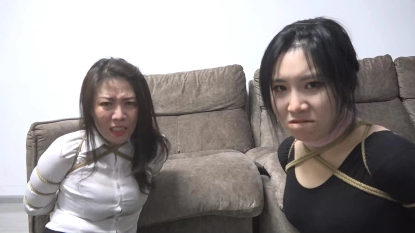 母女二人先互相用脚蹭开蒙嘴的的布条,用脚夹出堵嘴物。