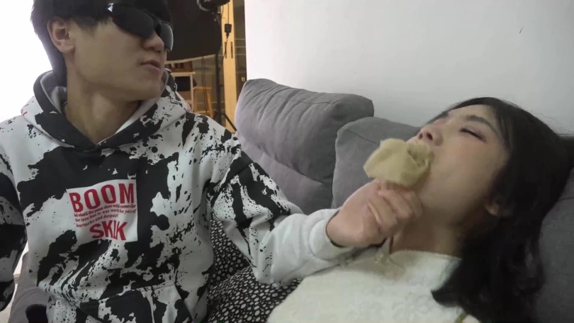 劫匪用黑色电工胶布封在晓璐嘴外,再用黑色静电胶带缠绕封住晓璐的嘴,把她驷马捆绑放置在沙发前地上。