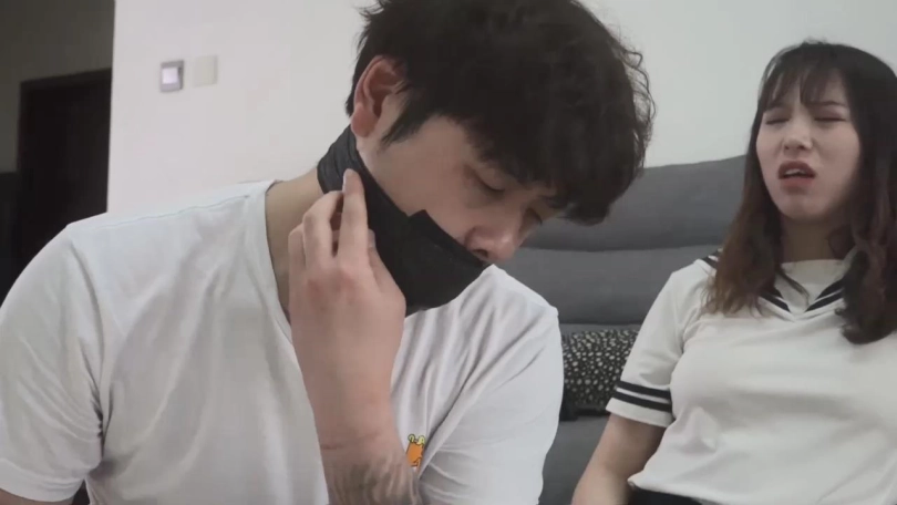 阿妙与男友互相对视呜呜闷哼抱怨着。