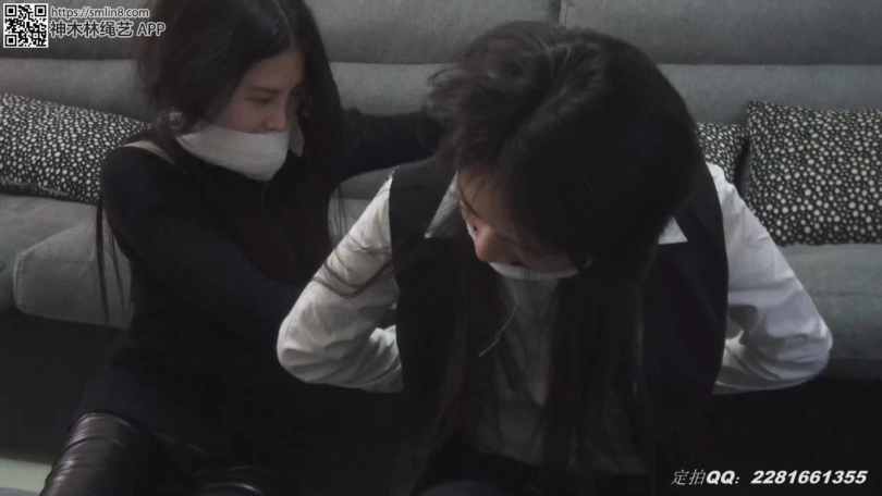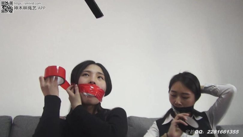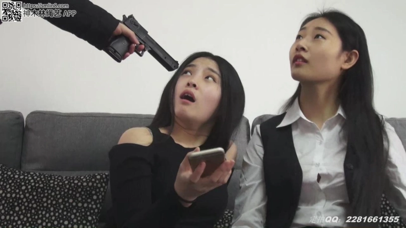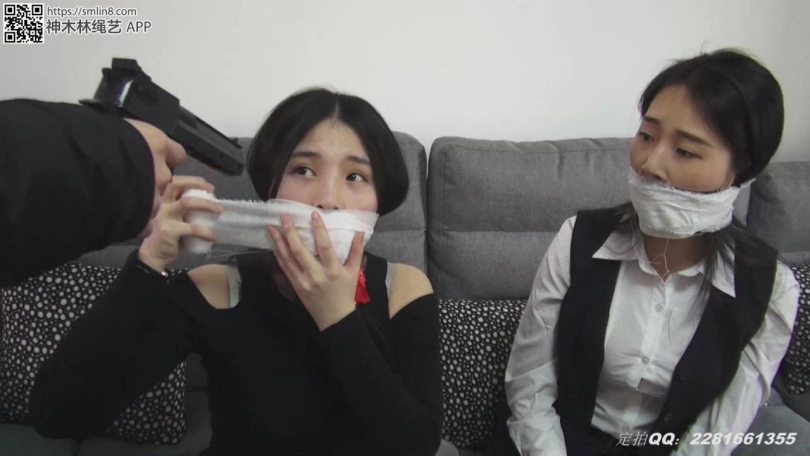 两个美女家中聊天,忽然一个持枪劫匪闯进家中,在歹徒威胁下,二女自己动手把嘴巴塞进堵严,又用胶带和纱布层层缠紧。。。歹徒走后,二女拼命挣扎,终于挣脱层层束缚。。。