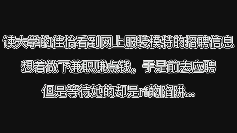 读大学的佳怡看到网上服装模特的招聘信息,想着做下兼职赚点钱,于是前去应聘,但是等待她的却是rf的陷阱...
