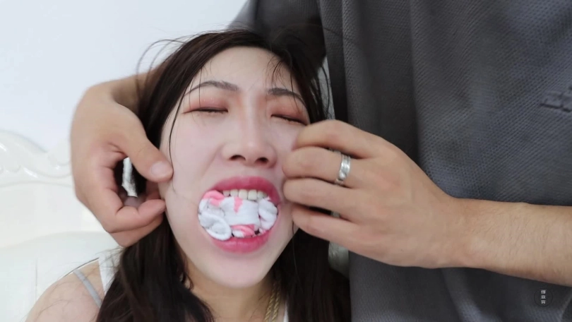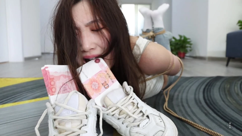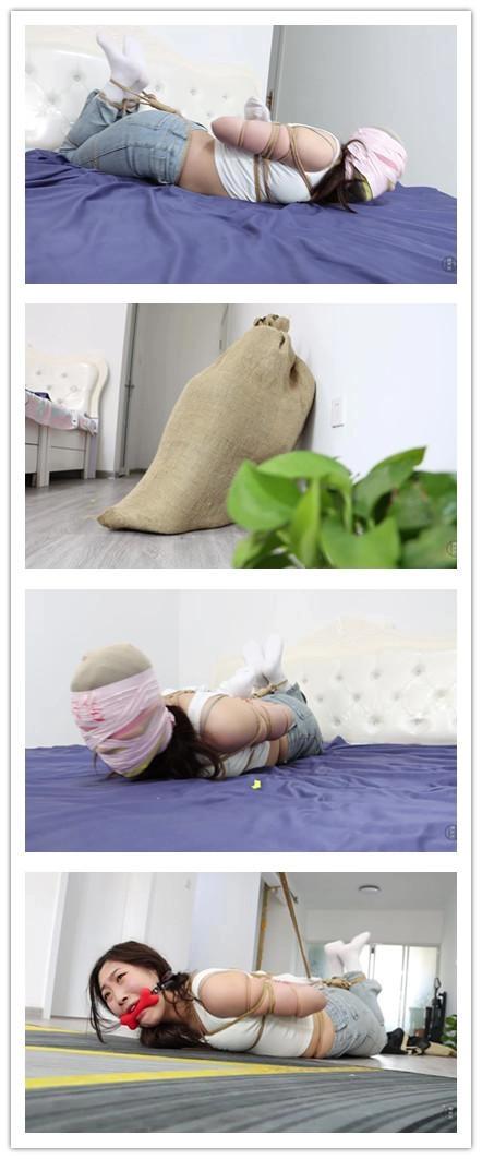安安又把钱花完了,没办法的她只好打响了男闺蜜的电话,平时都能借到钱的她,这次碰上了聪明的男闺蜜,男人说:除非做他女朋友,不然不借。安安可不愿意,还当面骂人家屌丝,还说自己有的是愿意借钱的男人!不是不报,时候未到。安安玩了会手机,穿鞋出门去吃饭,可一开门,男人出现,并将枪[X_X]她的嘴里,把她逼到房间后,然后做屈辱姿势,撅起屁股然后捆绑她。安安被绑得结结实实,手上还套上了白袜,嘴巴被男人用粉白麻叶袜子堵得死死的,再用银色胶带缠绕封上。黄色麻叶袜子封住眼睛,胶带固定。身上绑着绳子的安安只能扭动身子,口不能说,眼不能看。男人还没爽够,把她塞入麻袋里,让她在里面尽情挣扎。一会,男主回来,解开麻袋,解开安安嘴眼封印,又在她的大嘴巴里塞入五张纸巾,接着红色口球戴上伺候,再套入麻袋,又将麻袋套入收纳袋将其运送走。镜头一转,安安被带到不知何地,男主开始对她进行折磨。从麻袋出来的安安被捆绑成驷马倒攒蹄,戴上骨头口球,闻自己的臭鞋,然后男人将钱放入臭鞋里,让她爬过去叼出来,可这是个总不可能完成的任务。任务失败的安安被捂晕,接着结实捆绑在床上,男人用黄色麻叶袜子堵住她的嘴巴,再各种颜色胶带封上,丝袜套头再封,最后写上“肉货”,让她等待命运安排。